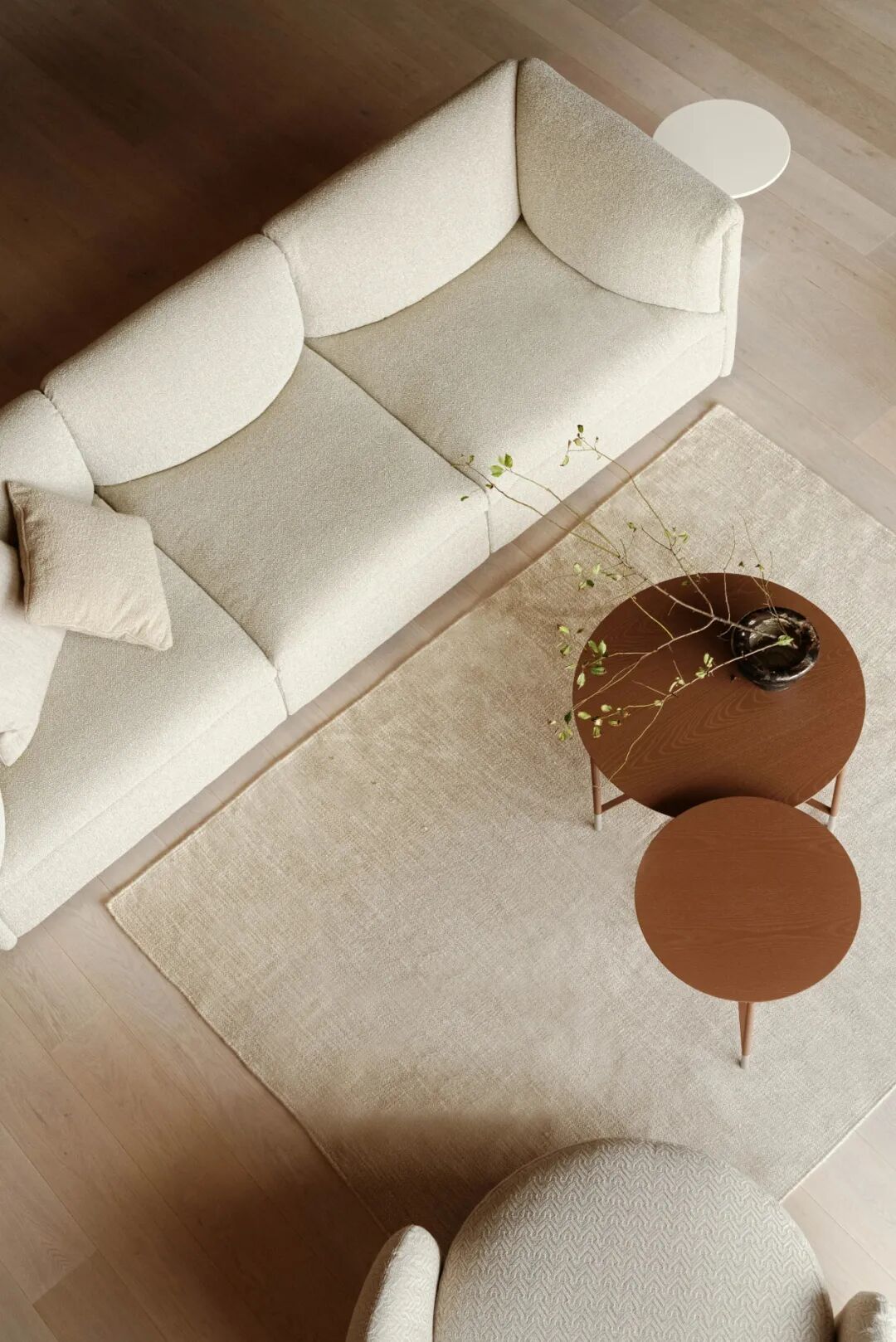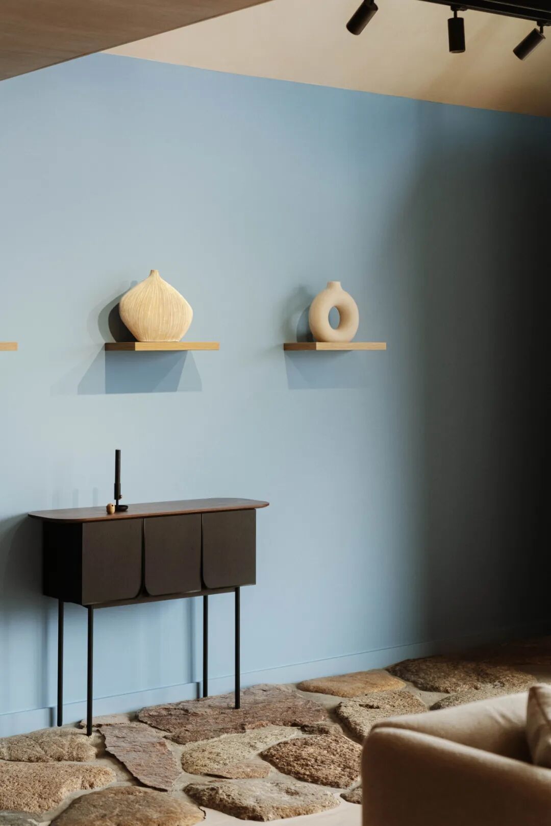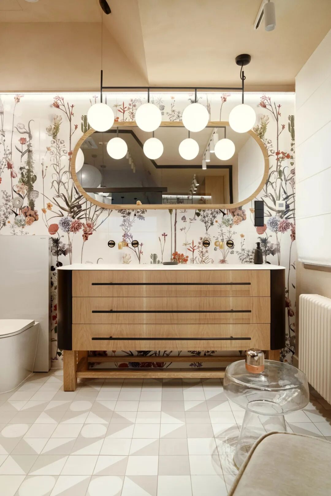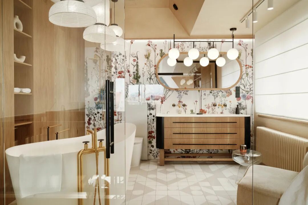 This interior is full of details, references, and subtle minimalism, which intertwines with unique upholstery and the influence of many cultures. The bathroom on the floor is the quintessence of Japan and femininity.