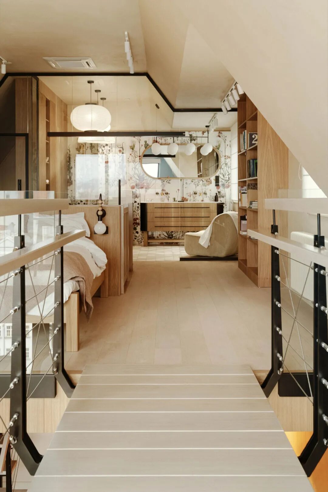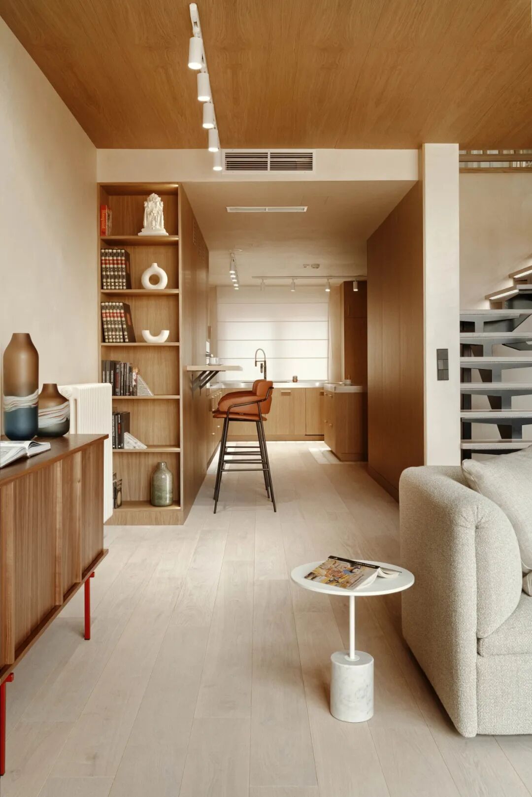 从功能上看,该项目类似于一栋独栋住宅:一楼有客厅、厨房和小浴室,另一层是一间带大浴室和更衣室的特殊主卧室。
