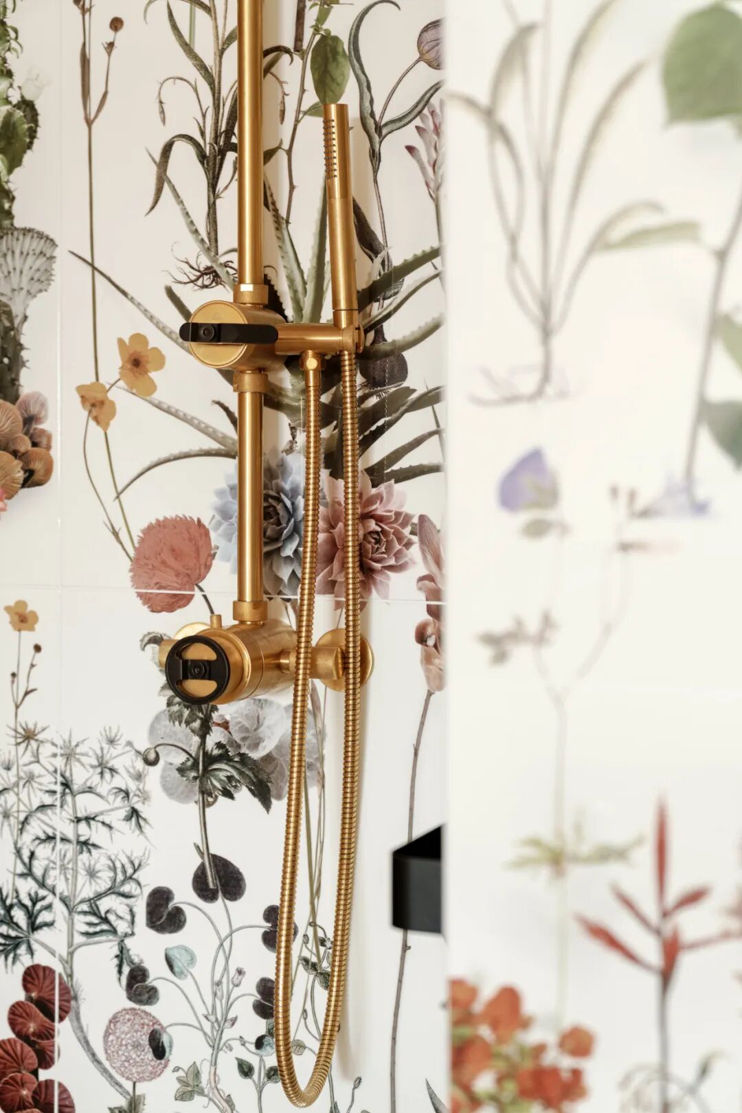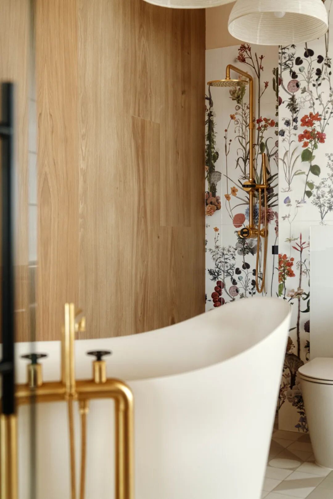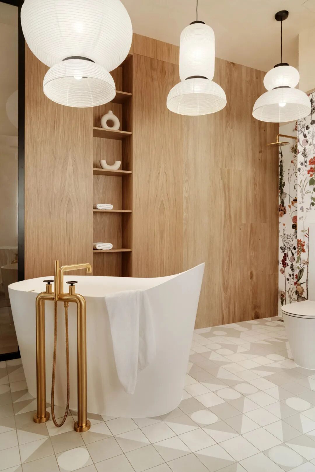 Delicate traditional East Asian bathtub, flowers, and geometry on the floor. The whole completed with brushed brass fittings. We invite you to an expedition in an original space, which is far from obviousness and repetitive interiors.