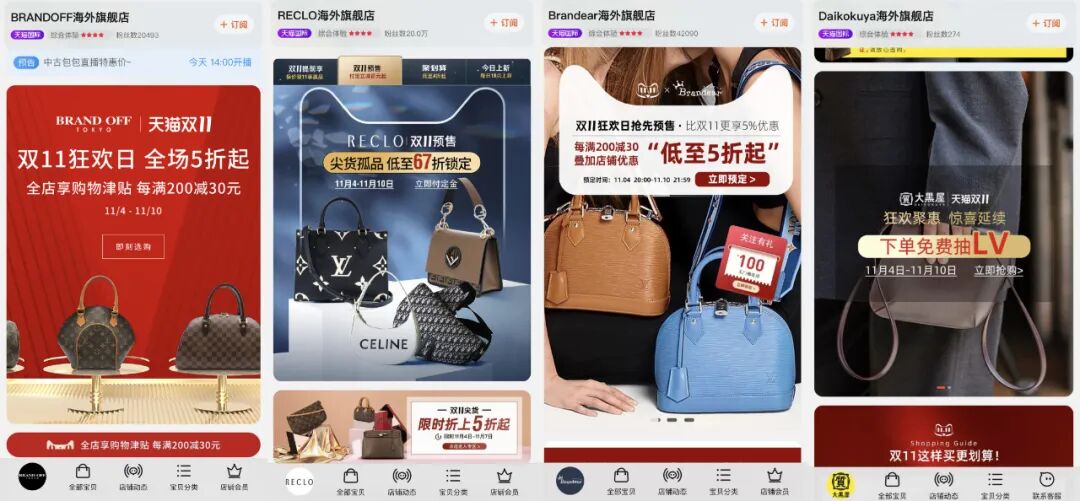 天猫国际上,来自日本一大波中古名店RECLO、Brandear、Brand Off、大黑屋等,正在积极抢夺天猫上的二手奢侈品市场,花式上演“双11活动”。