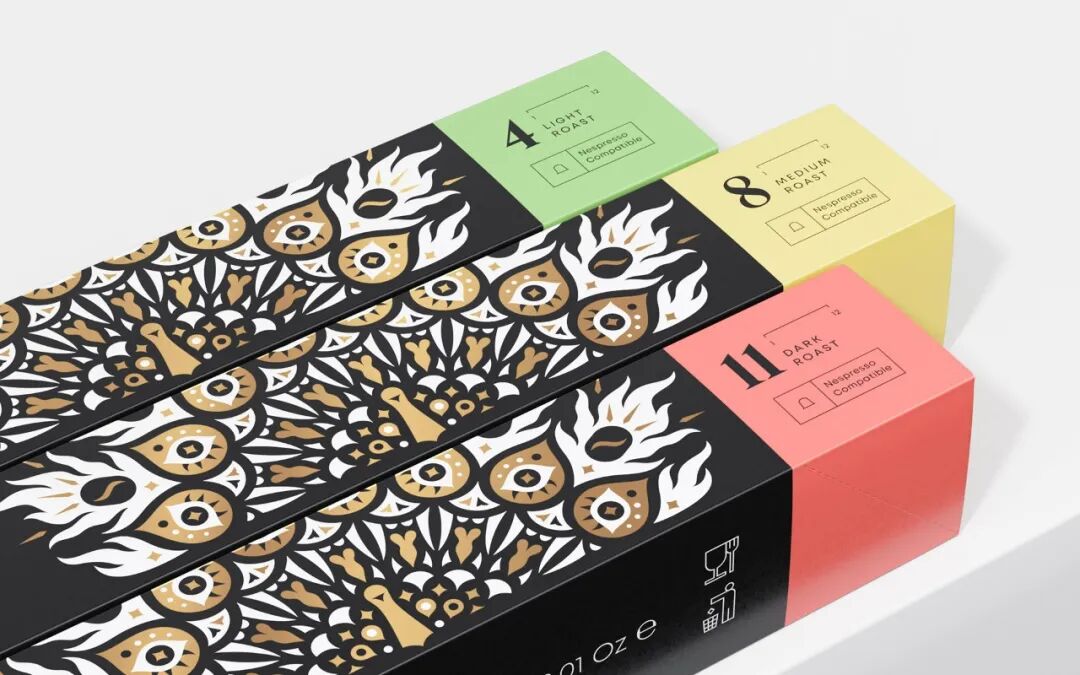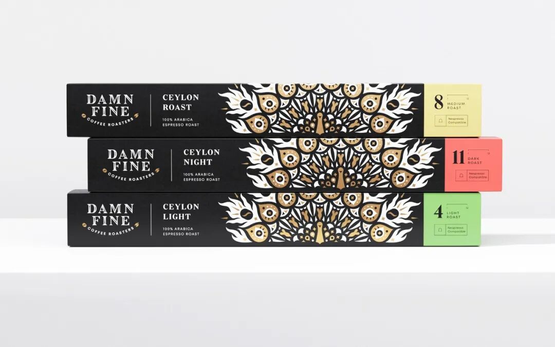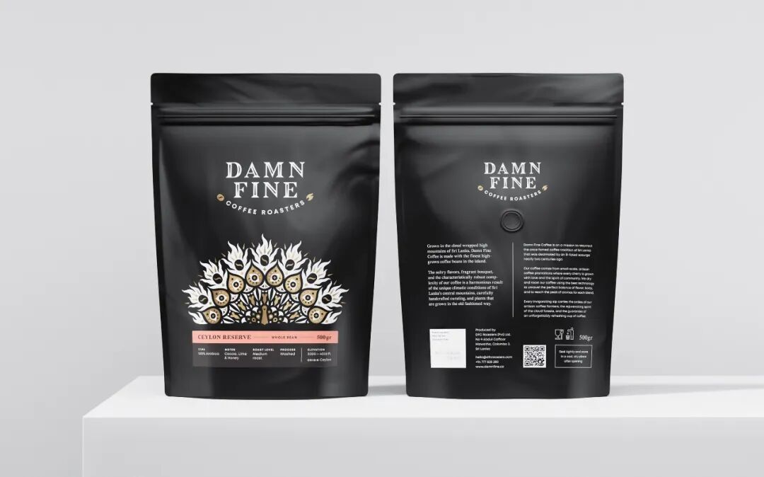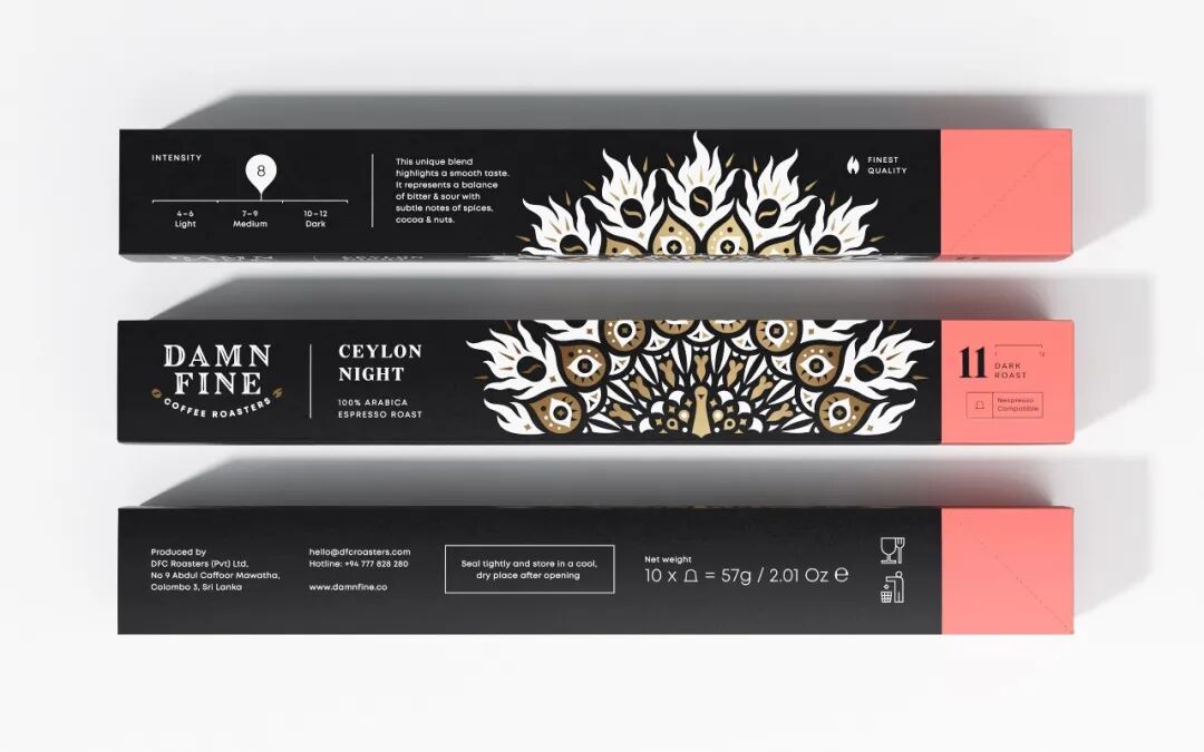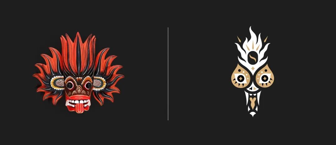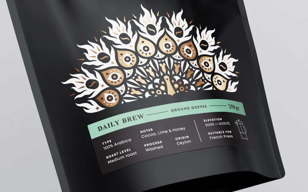 设计目标之一是强调产品的锡兰原产地,我们将这一信息轻轻地编入插图。在包装系列的主角孔雀的尾巴上,也是斯里兰卡的象征之一,你可以找到烤咖啡豆以及斯里兰卡国家 Raksha 面具。