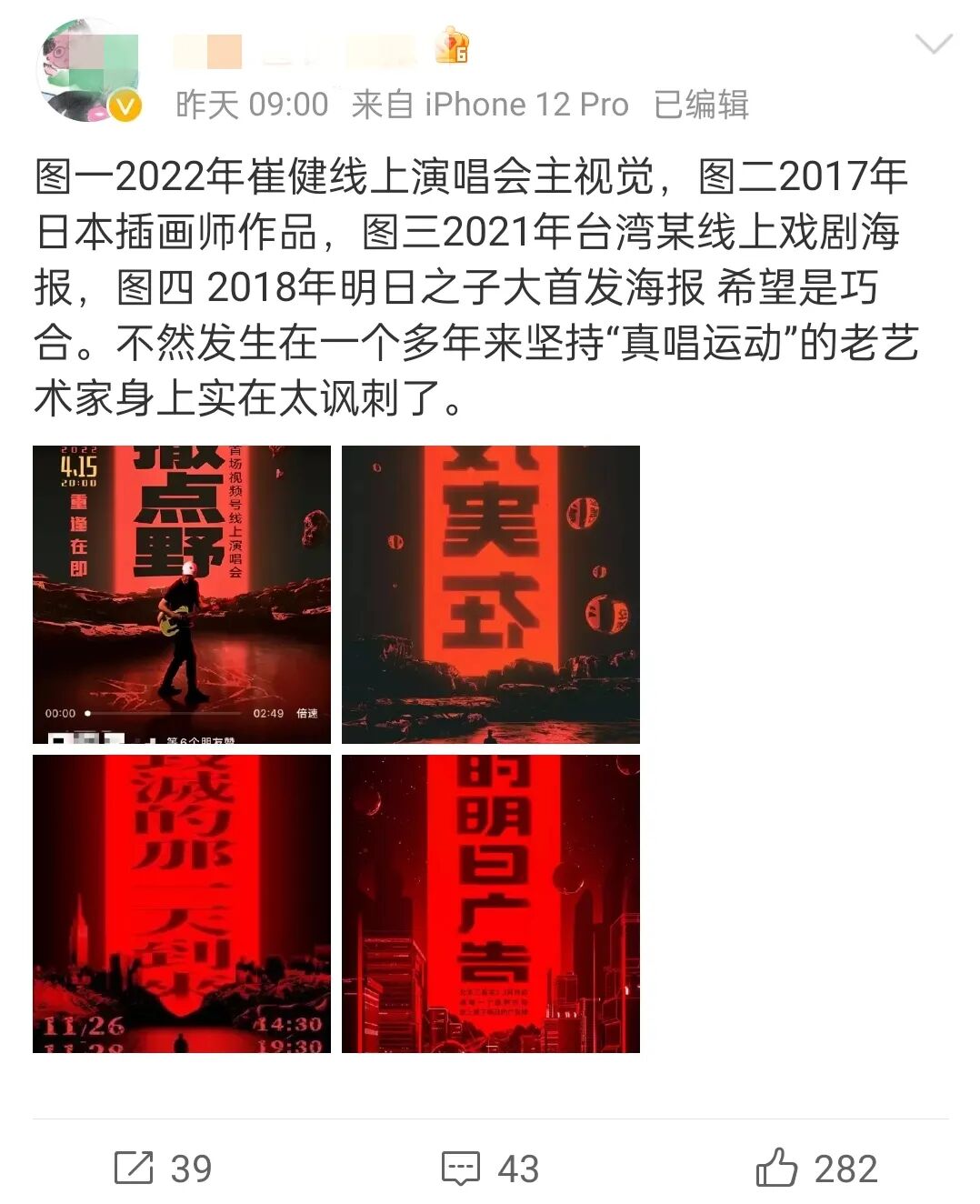 然而,经历了刷屏之后,崔健演唱会陷入了抄袭的争议。有网友收集了三张近似的海报。分享是日本插画师作品、台湾某线上戏剧海报以及2018年明日之子大首发海报。