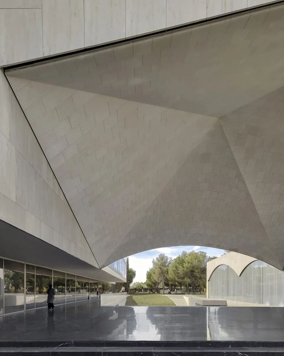 在该项目中,弧形褶皱是对拓扑空间的复杂外力的回应。它不是折纸,而是一种形式的拓扑表达——回应外力的结构平衡。