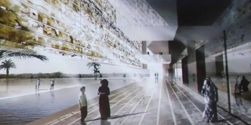 这是S-M.A.O.在埃及开罗的一个项目,整体划分出了绿化景观带、水带、灰空间带和实体建筑带四个层次。