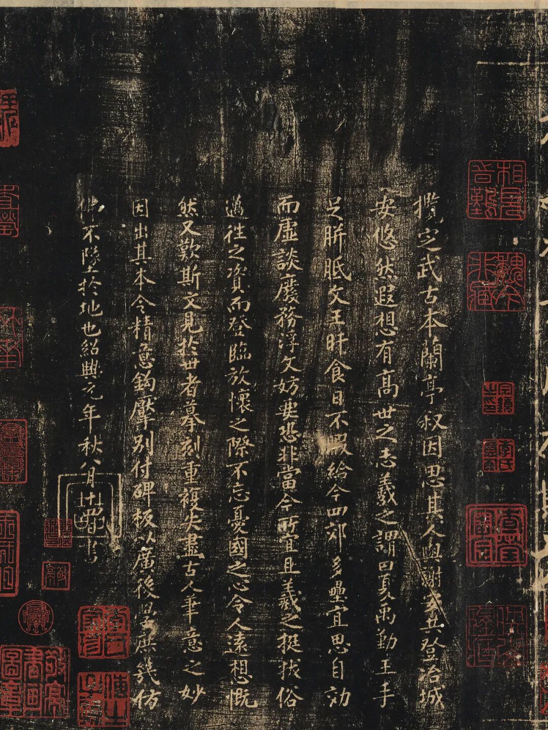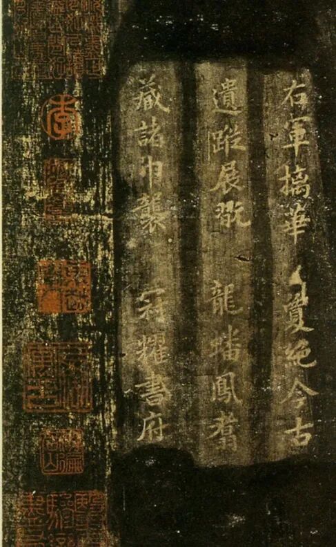 绍兴庚申十年(1140)御制御书《复古殿兰亭赞》:“右军笔法,变化无穷。禊亭遗墨,行书之宗。奇踪既泯,石刻亦工。临仿者谁,鉴明于铜。”