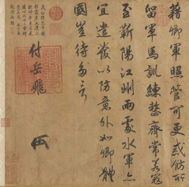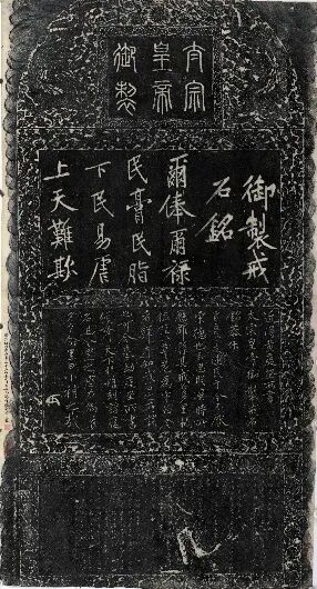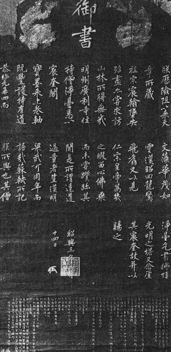 显然,赵构正是发挥了自己的书法特长,作为“中兴”之初展开实行“文物之治”这一赵宋政权的基本方针,有效地“巩固”他的政权统治。在绍兴前期韩世忠、岳飞抗金得胜时,他曾分别书写“忠勇”“精忠”等字表其旌旗;为鼓动士类,他多次将自己所临古法帖、所书经、传、史、诗付赐宰执,还不免以此教导一番;太学建成,应允臣下之请,将自己所书“六经”等数十万字刊石建阁于其中;每逢大举,必亲洒宸翰赐新第进士。在南宋人所编撰的《建炎以来系年要录》《建炎以来朝野杂记》《皇朝中兴纪事本末》(《中兴小纪》)、《南宋馆阁录》《南宋馆阁续录》《四朝闻见录》《玉海》和《景定建康志》《咸淳临安志》等书中,相关记载随处可见。