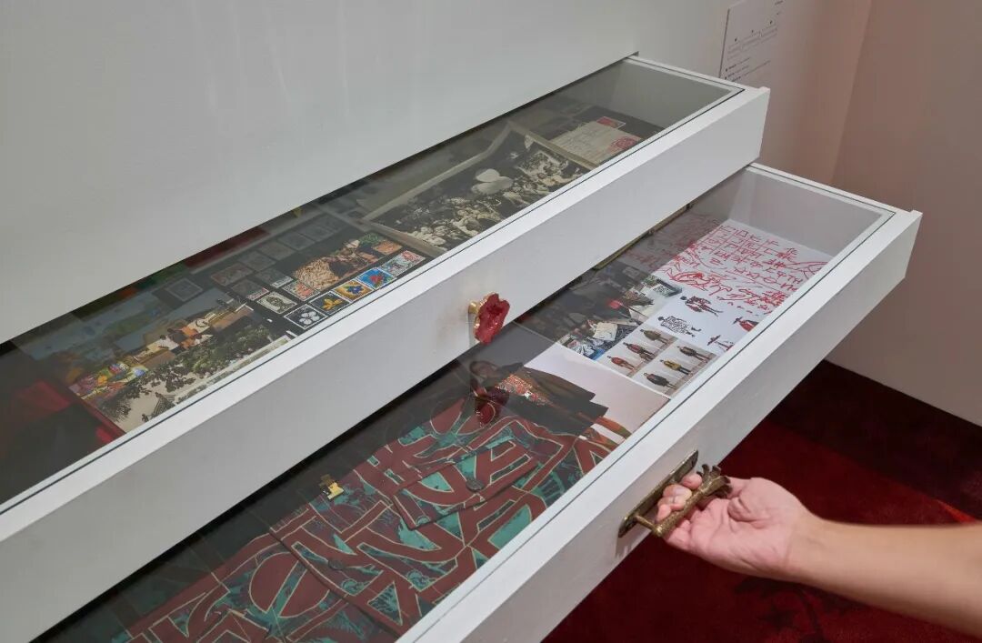 蒲英玮《红婴》,20×30cm,布面油画、亚克力、绢、邮票、纸本印刷、金箔、丝网印刷、黄铜,2021-2022,图片鸣谢艺术家与蜂巢当代艺术中心