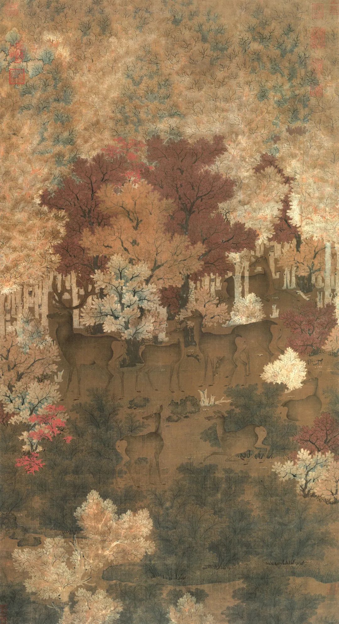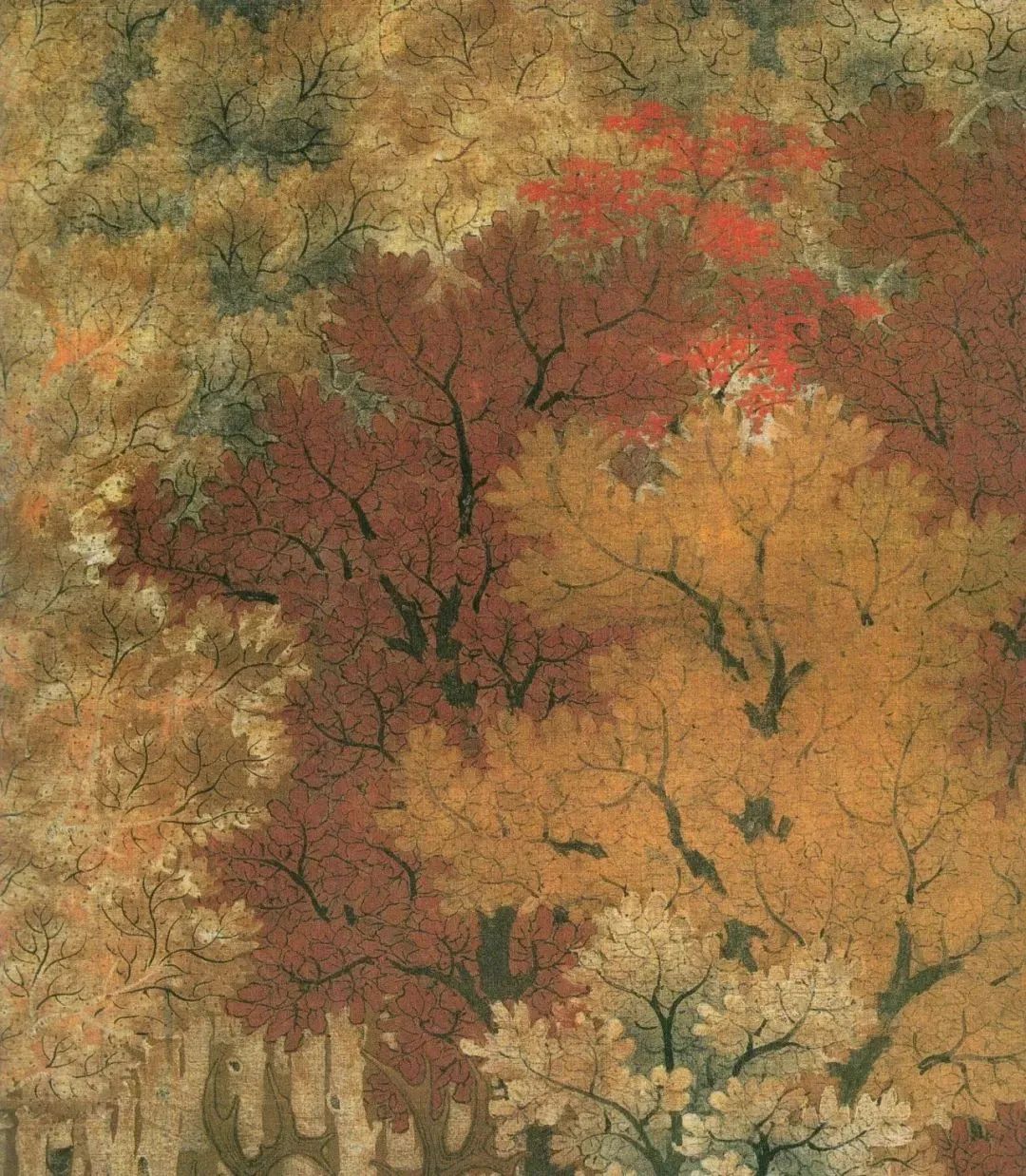 此图穷尽中国画“五彩”之能事,在有限的色谱阐述秋之绚烂,一如尘世间总是繁华过后尽疮痍,挽留一年最后的繁华!