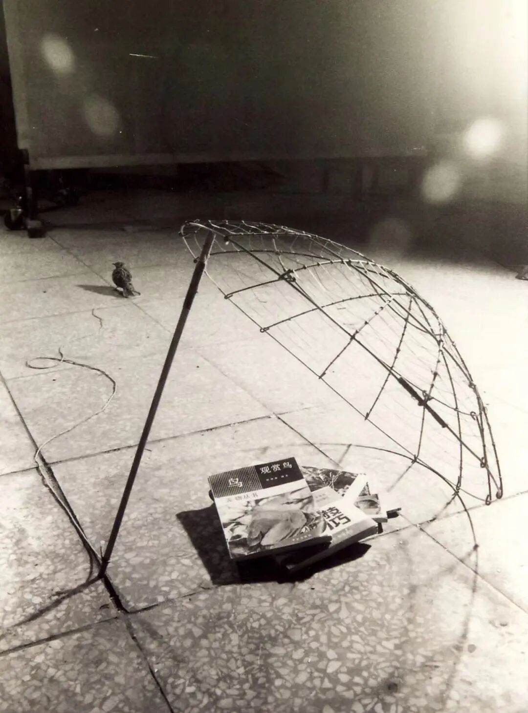展望《捕鸟器》,尺寸可变,铁丝网罩、一只鸟和几本关于鸟类的书,1995,图片由艺术家提供