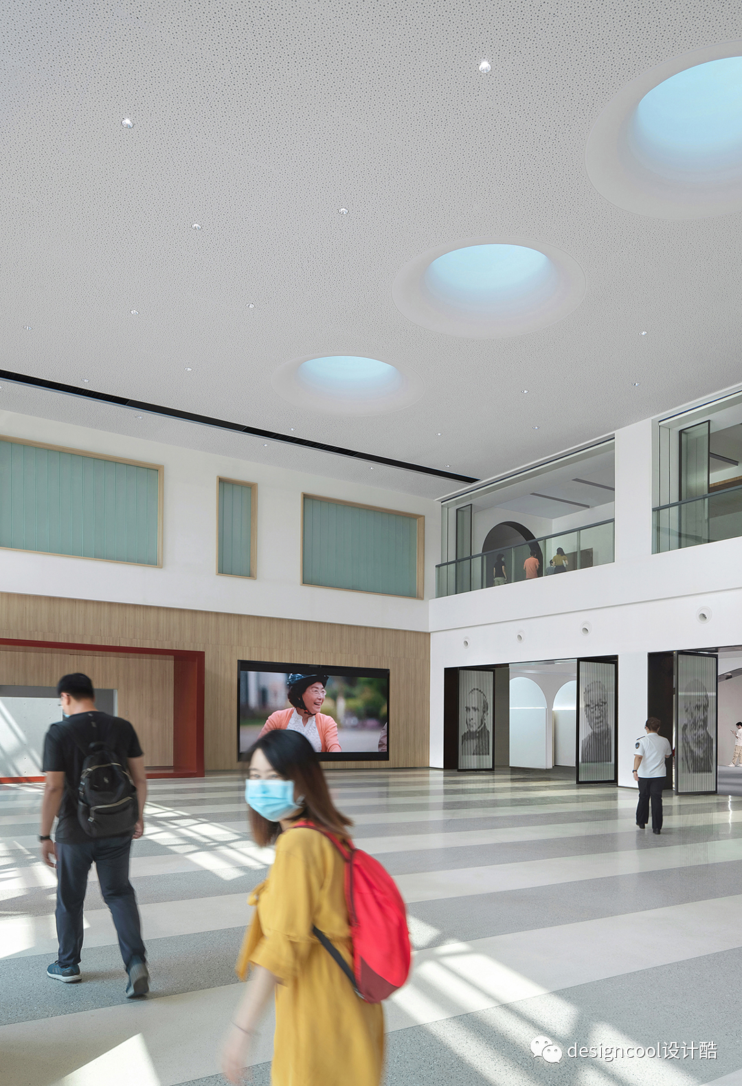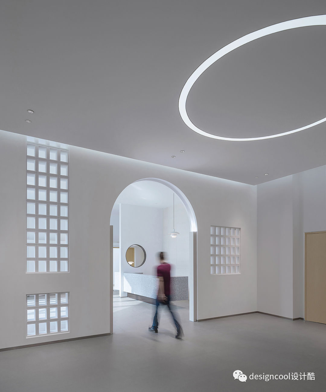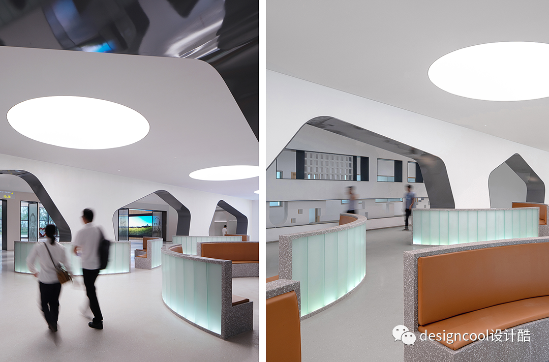 多功能公共卫生信息发布厅原本全无自然采光,通过将布满屋面的风机设备重新设计排布,两侧拾掇出400宽的地带,调整结构,打开屋面,引光入室,形成“光的峡谷”;北塔楼门厅反弧形天花造型是由于大型排烟风管的横亘造成局部标高降低的地域性文化形式理性回应……