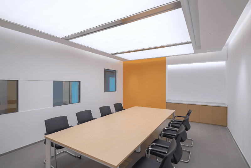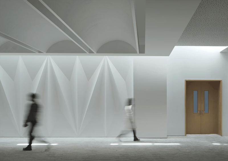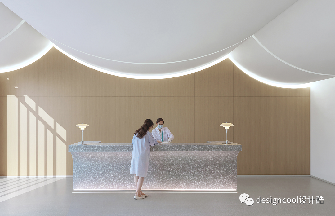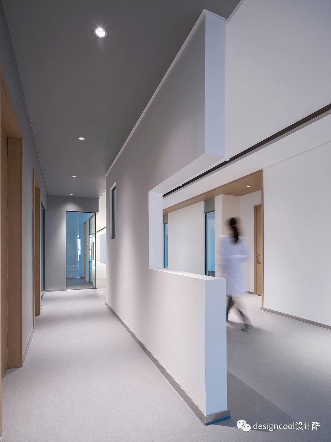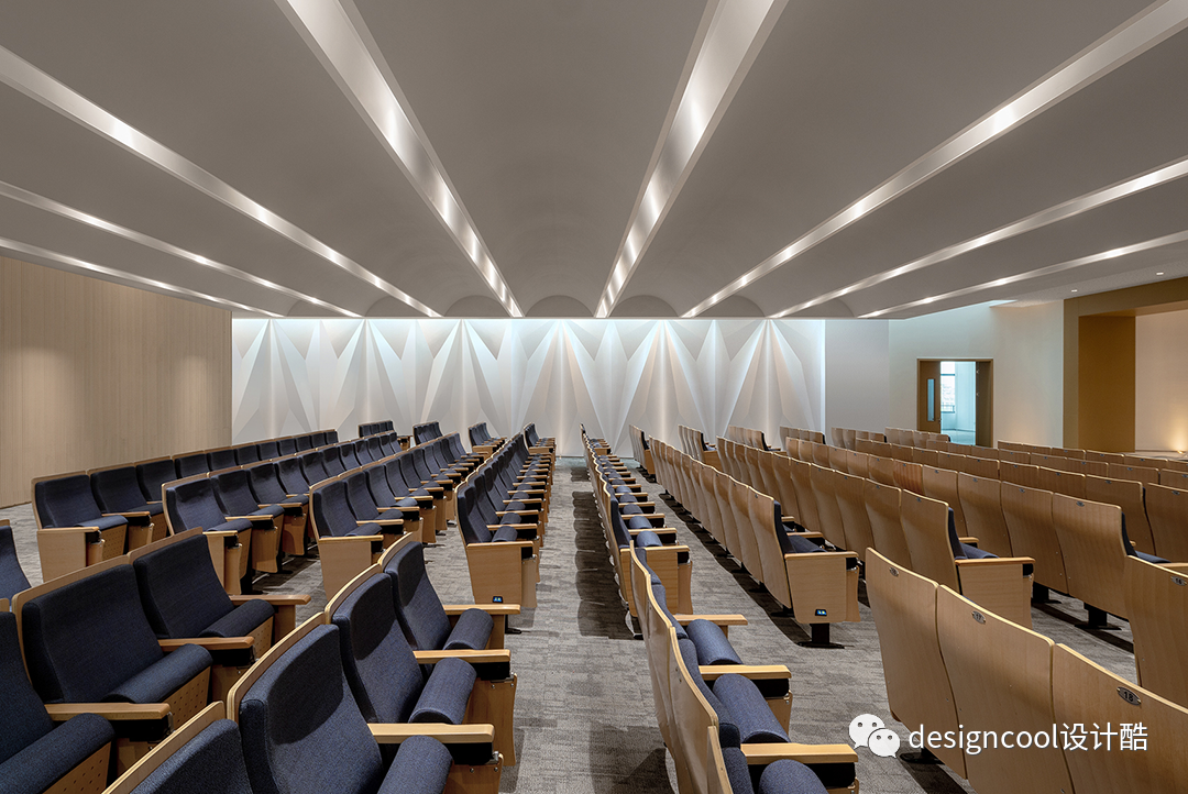 多功能公共卫生信息发布厅原本全无自然采光,通过将布满屋面的风机设备重新设计排布,两侧拾掇出400宽的地带,调整结构,打开屋面,引光入室,形成“光的峡谷”;北塔楼门厅反弧形天花造型是由于大型排烟风管的横亘造成局部标高降低的地域性文化形式理性回应……