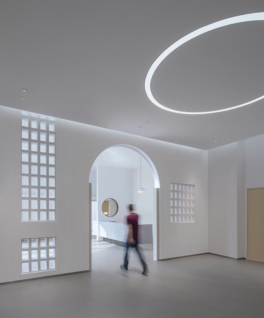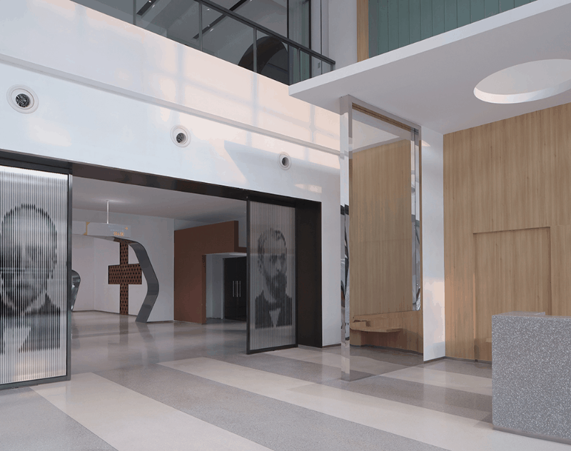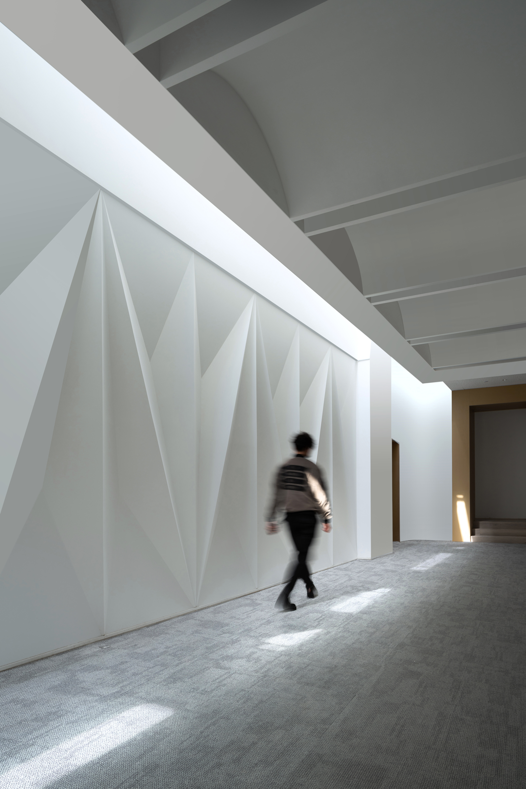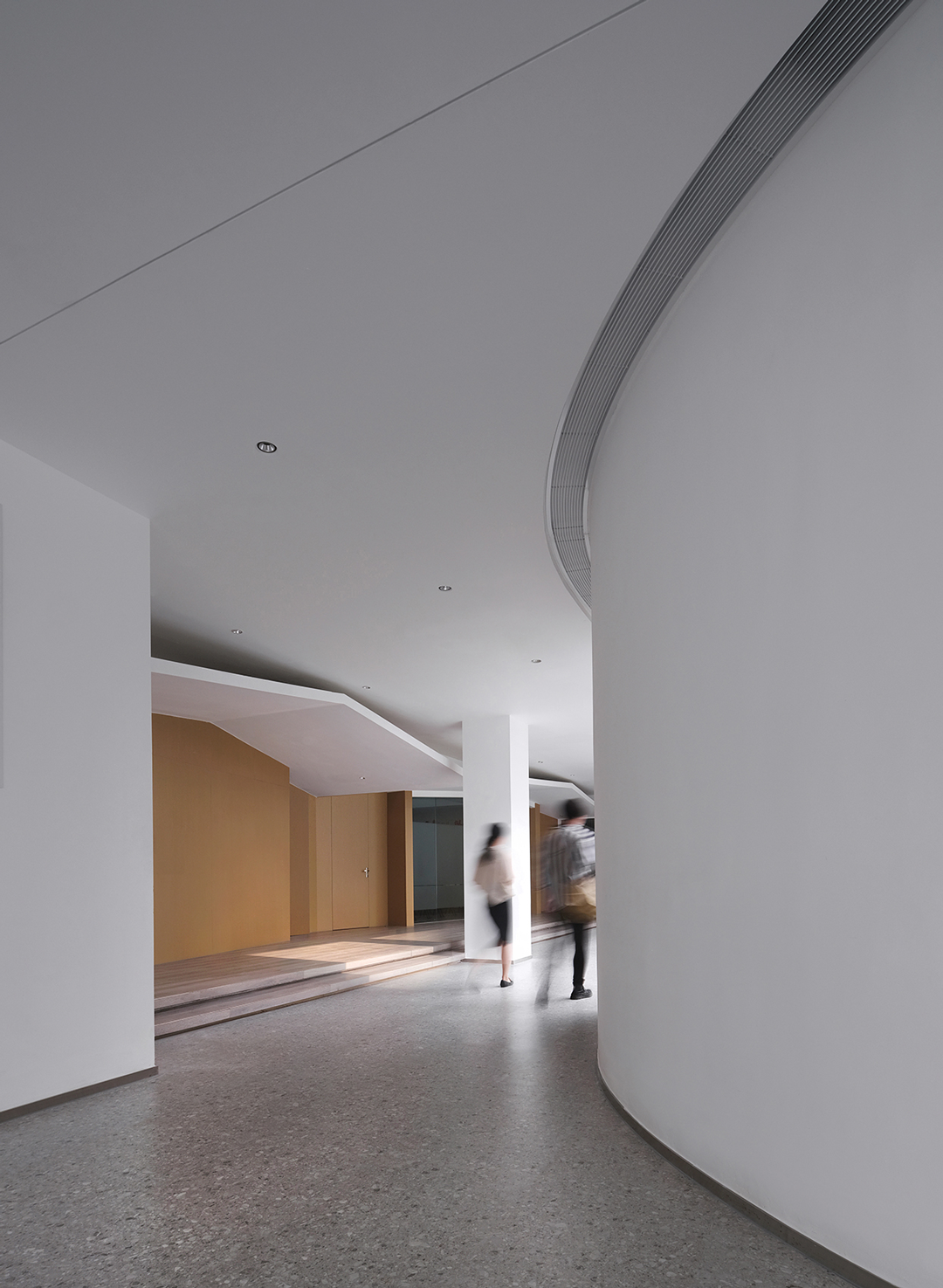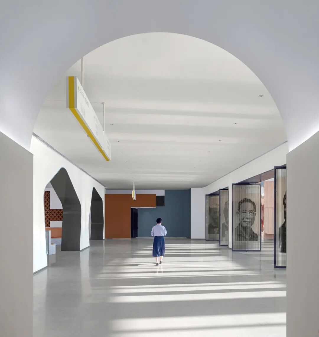 空间的功能性质和低成本建造的特点,也决定了设计思考更多着眼于空间形式与功能之间的理性对应表达:一层大厅两侧功能区入口形式的变化,源自对防火分区界面上多处防火门直面大厅的消隐处理,如明末著名造园家计成所著《园冶》兴造论所述--“俗则屏之,嘉则收之”,通过园林语言转折过渡空间流线,在消除立面视觉障碍的同时,也给各个功能区域赋予了新的空间变化与可识别性。