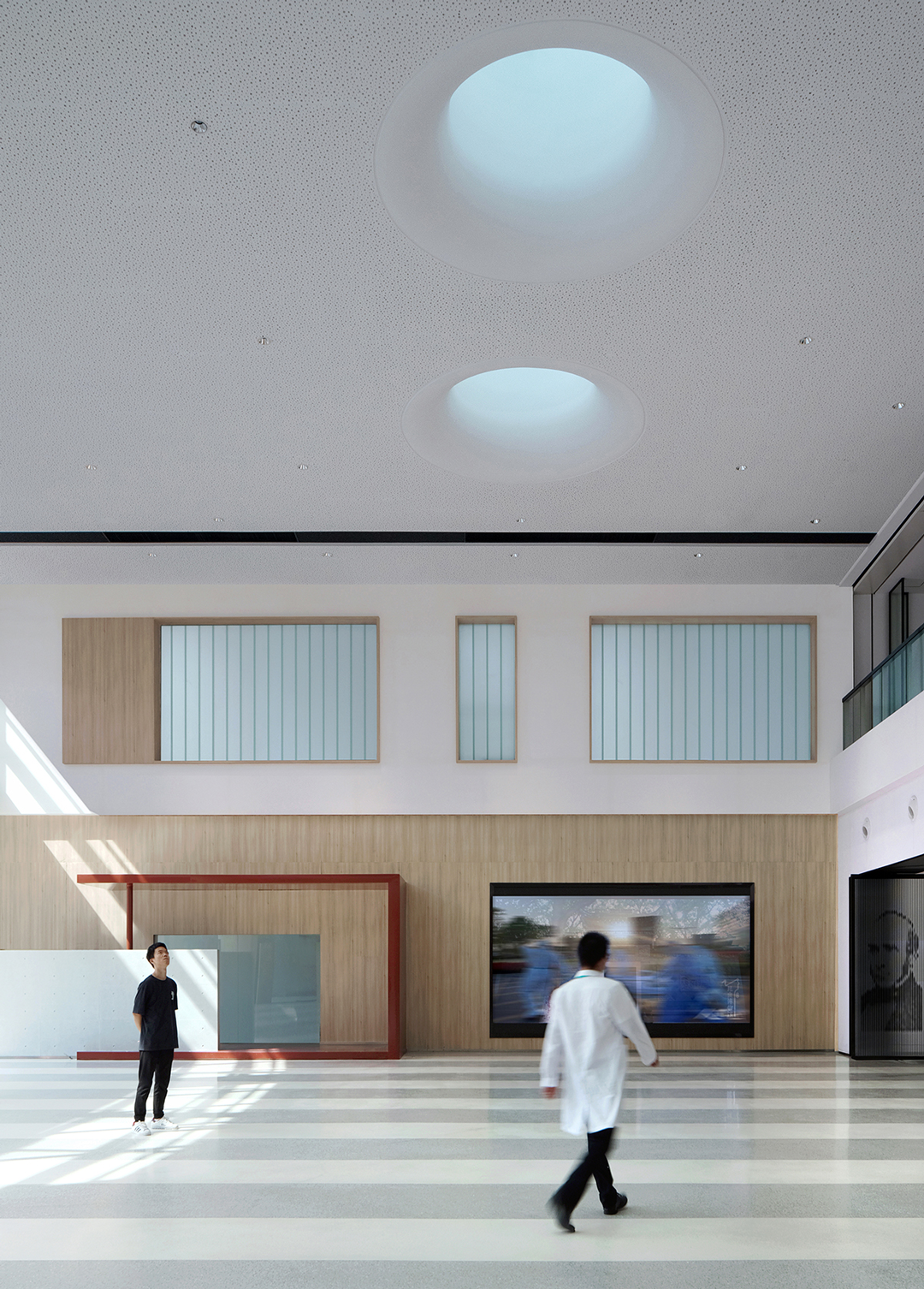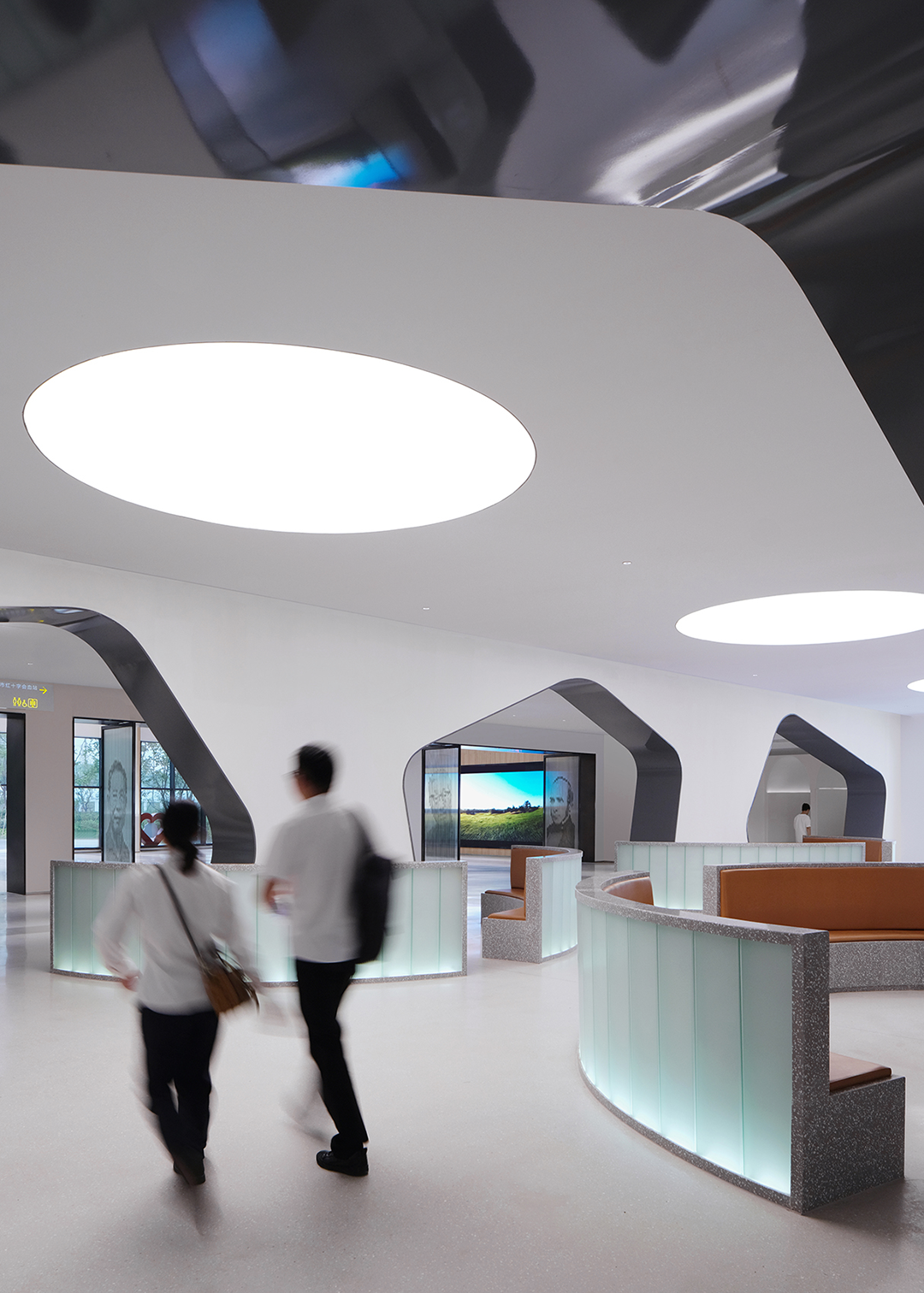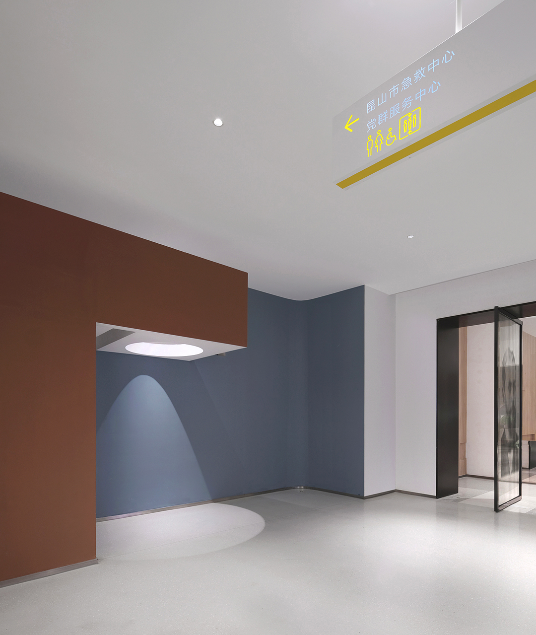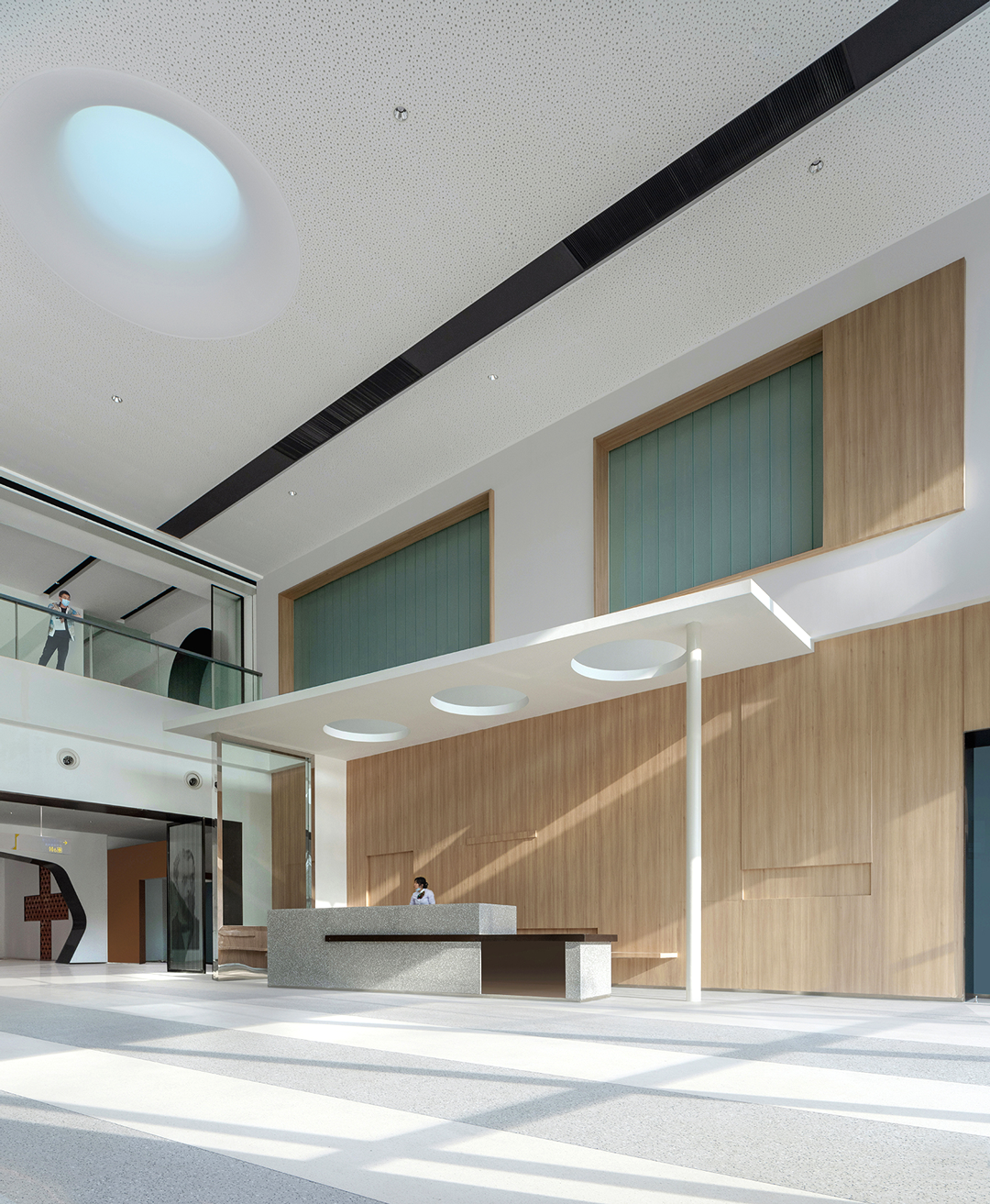 多功能公共卫生信息发布厅原本全无自然采光,通过将布满屋面的风机设备重新设计排布,两侧拾掇出400宽的地带,调整结构,打开屋面,引光入室,形成“光的峡谷”;北塔楼门厅反弧形天花造型,是由于大型排烟风管的横亘造成局部标高降低的地域性文化形式理性回应……