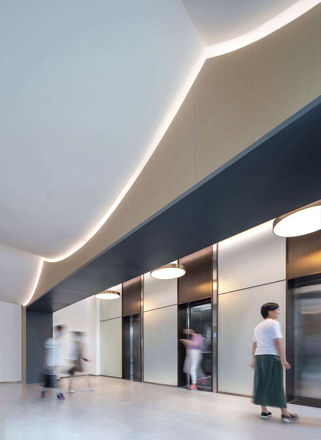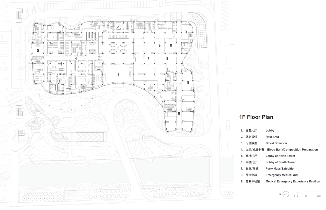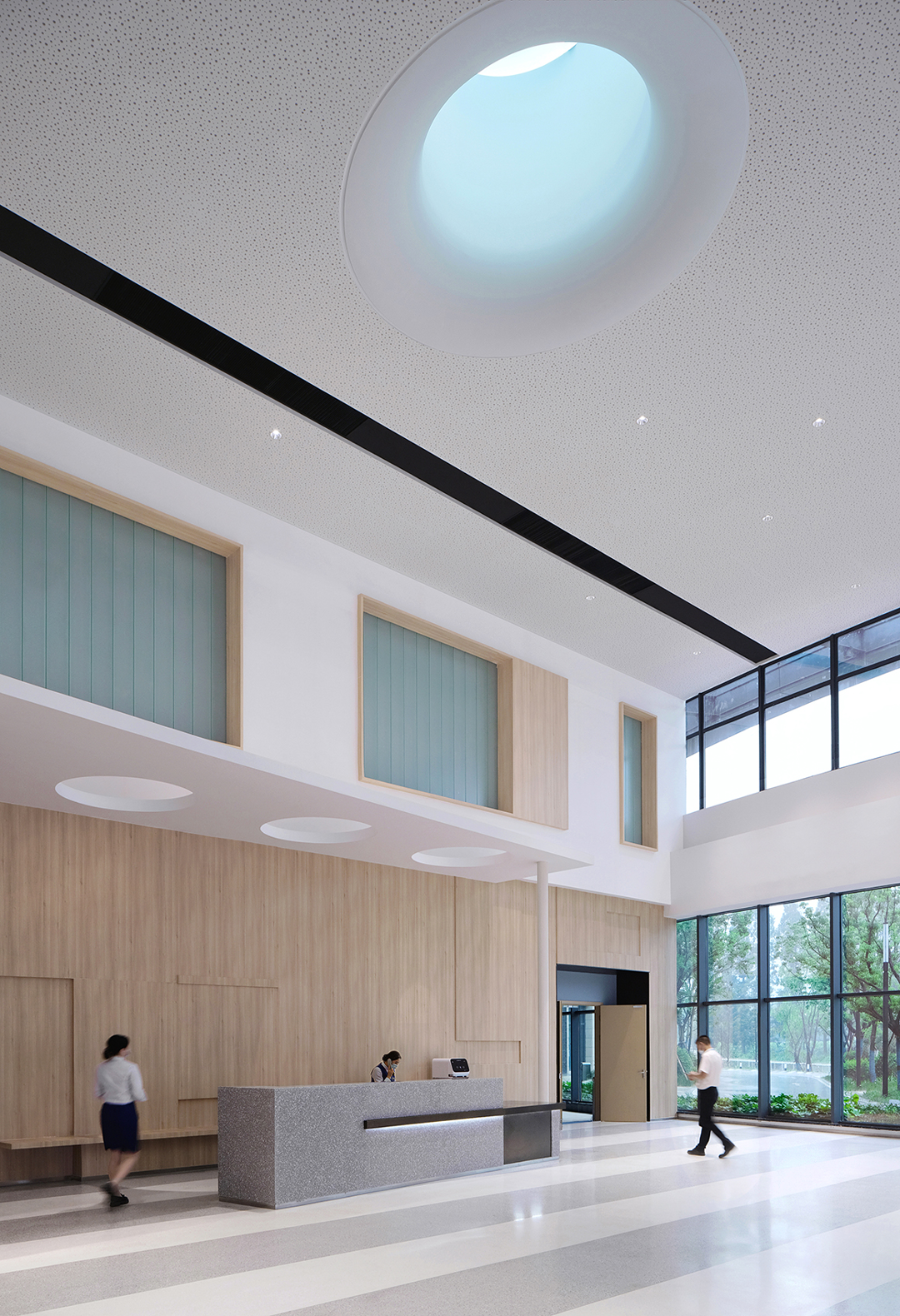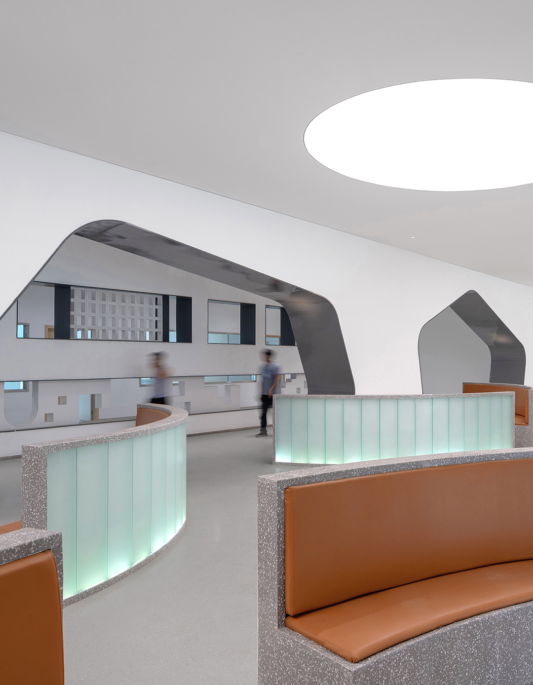 多功能公共卫生信息发布厅原本全无自然采光,通过将布满屋面的风机设备重新设计排布,两侧拾掇出400宽的地带,调整结构,打开屋面,引光入室,形成“光的峡谷”;北塔楼门厅反弧形天花造型,是由于大型排烟风管的横亘造成局部标高降低的地域性文化形式理性回应……