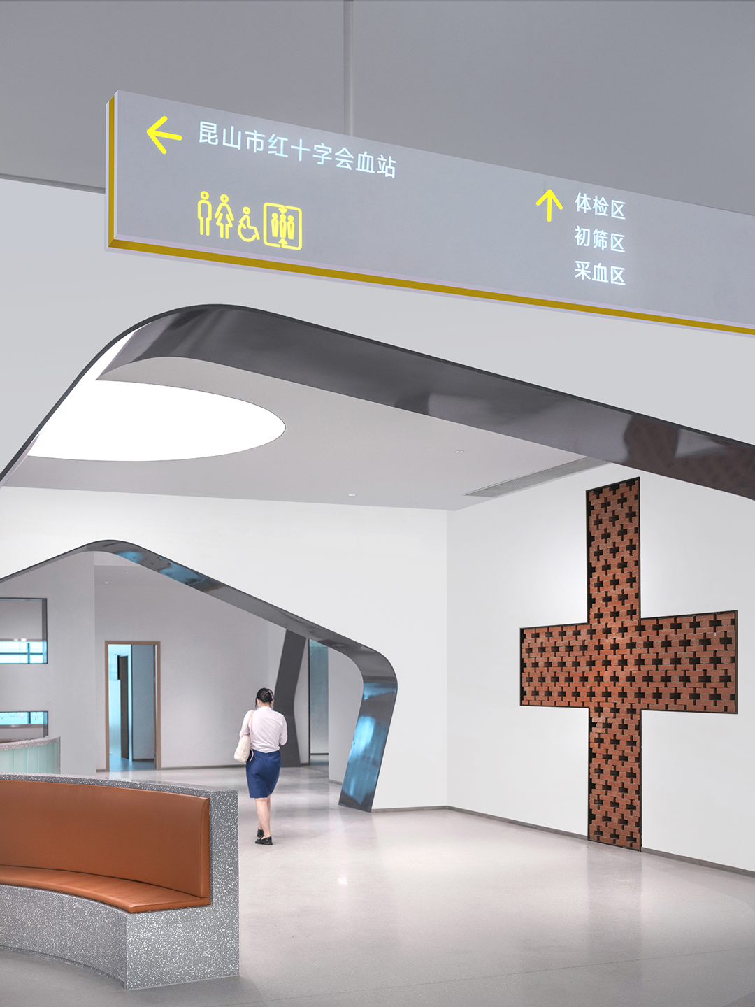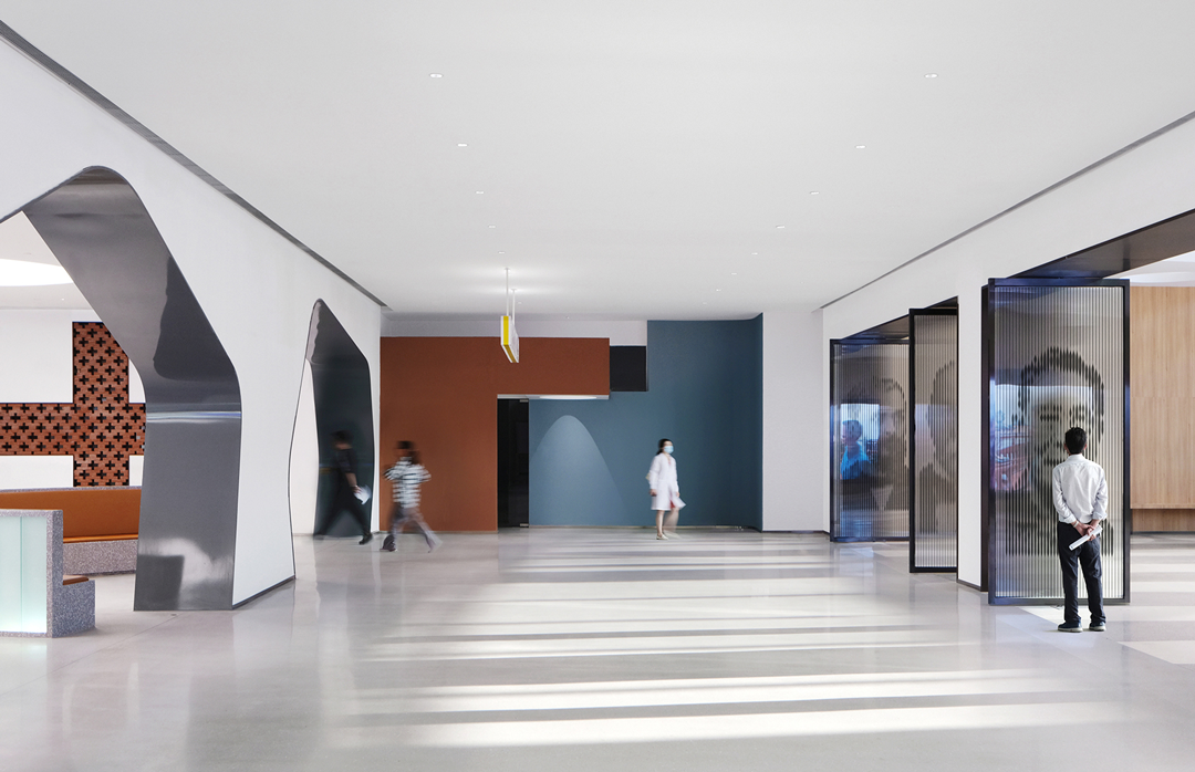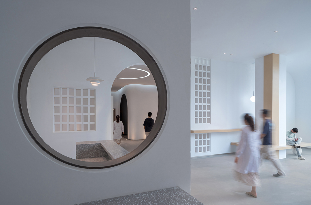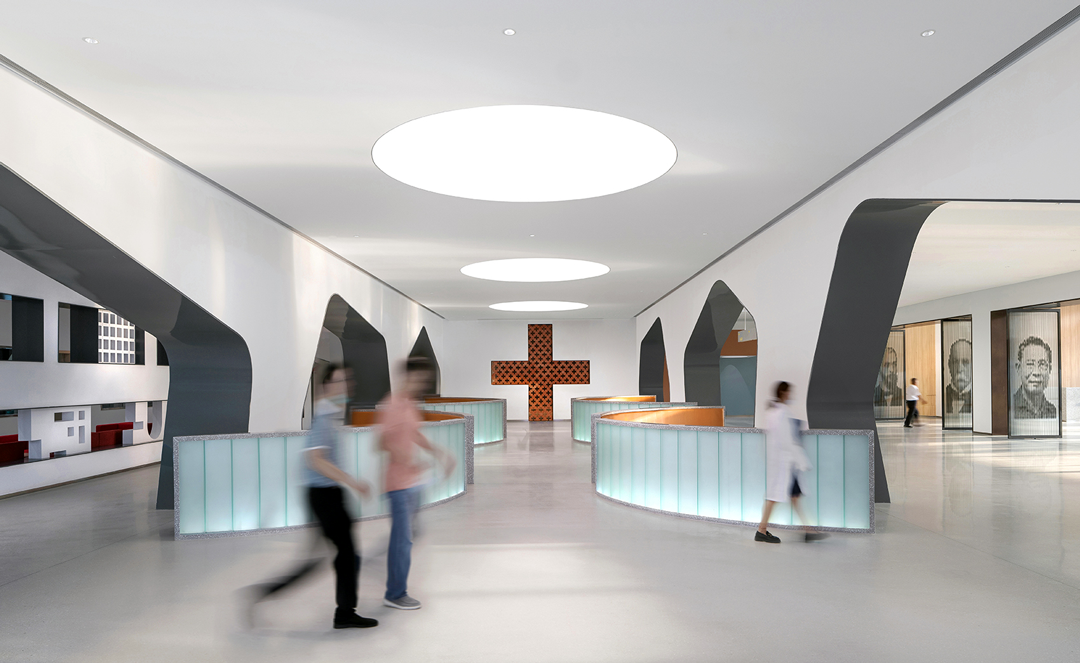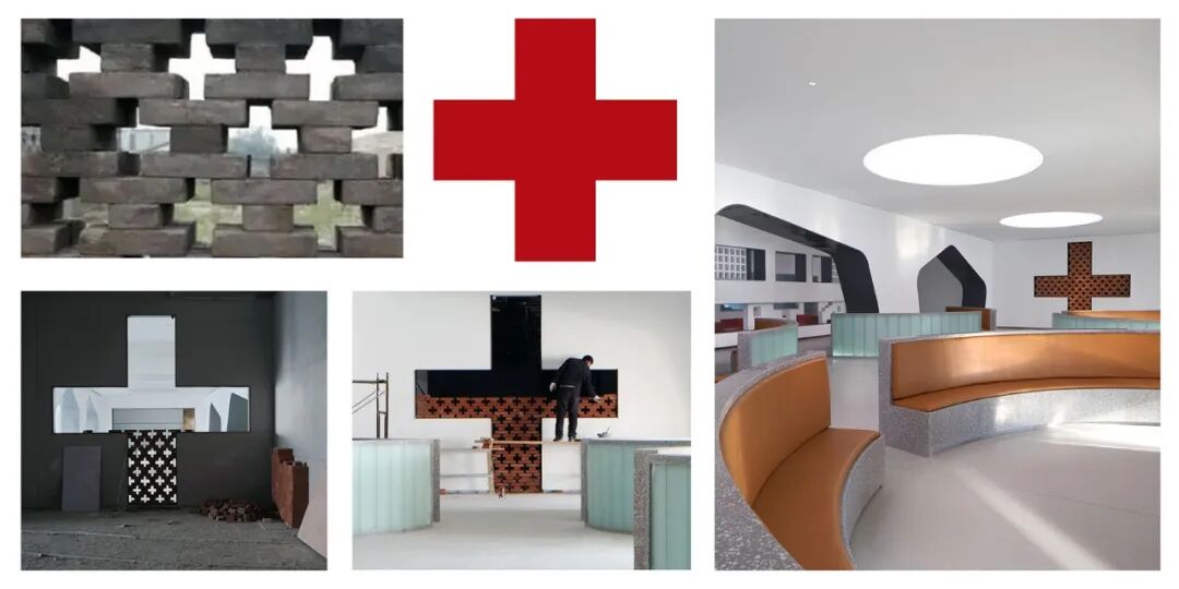 通过结合结构空间本身和材料的选择,对空间地域文化做适度表达。大厅休息区把孤立的结构柱重新缝合为打开拟石门洞的墙,红砖十字从砌筑方式到材料本身的属性都具有显性的传统建造含义,同时对红十字会功能性的贴合不言而喻。而采用数字技术实现的太湖石屏风,也是对地域文化特征的当代艺术化重构……