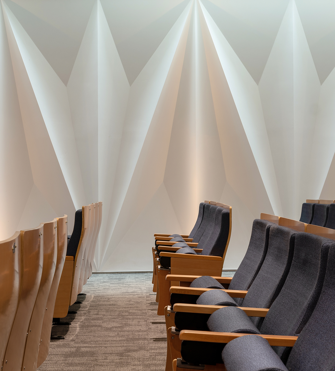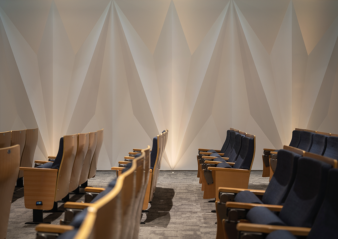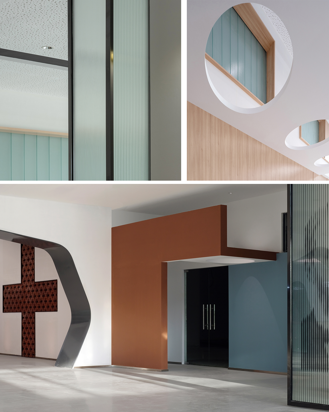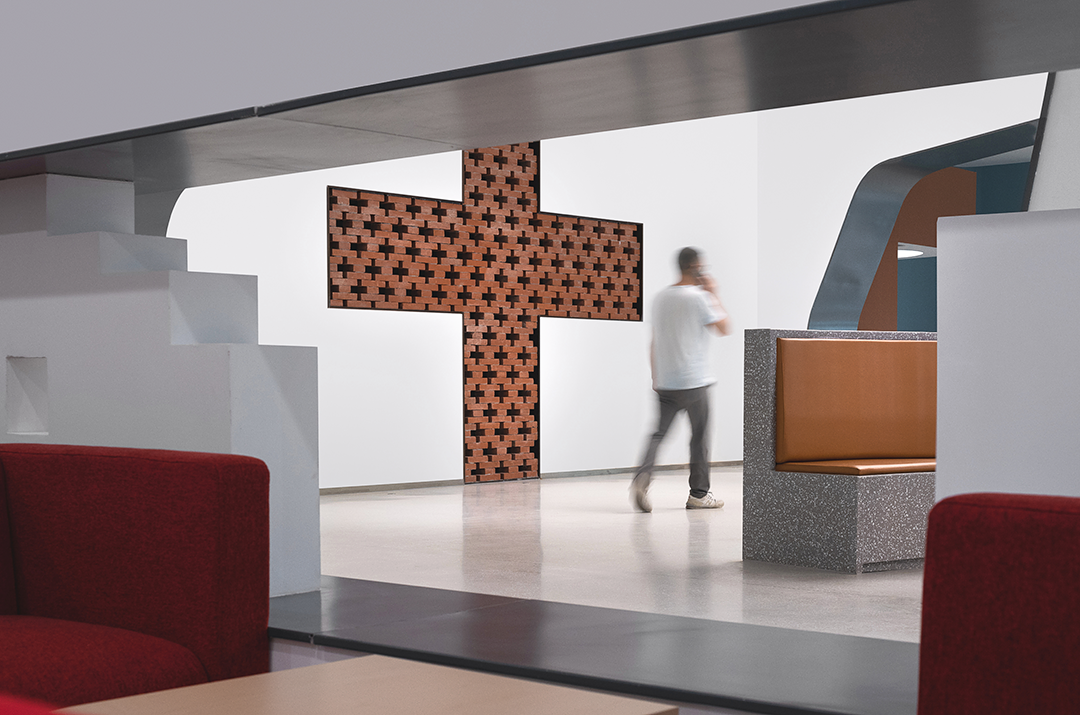通过结合结构空间本身和材料的选择,对空间地域文化做适度表达。大厅休息区把孤立的结构柱重新缝合为打开拟石门洞的墙,红砖十字从砌筑方式到材料本身的属性都具有显性的传统建造含义,同时对红十字会功能性的贴合不言而喻。而采用数字技术实现的太湖石屏风,也是对地域文化特征的当代艺术化重构……