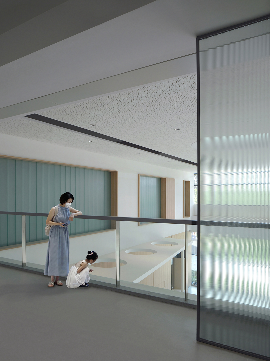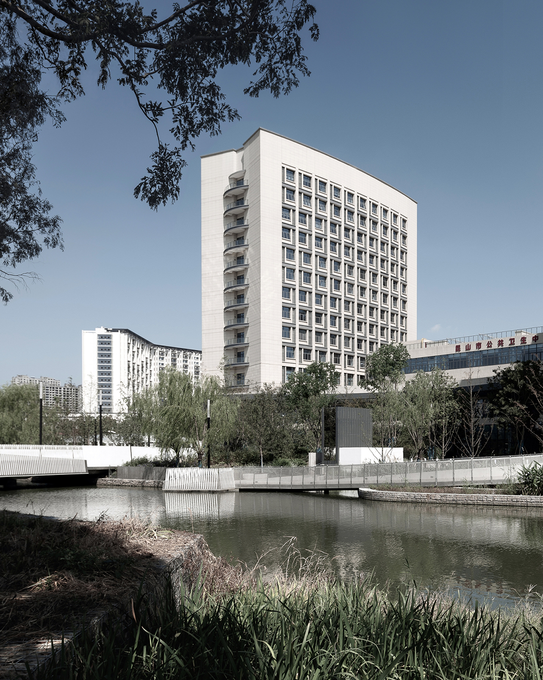 建筑入口通过新架设的两座景观桥与道路连接,透过河岸的水杉林望去,疫情之下,真实与恍惚之间,有种似曾相识的帕米欧肺病疗养院的时代穿越感。