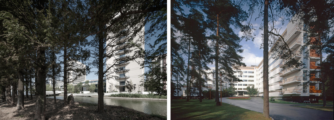 △左-透过水杉林的建筑,右-帕米欧疗养院-阿尔瓦·阿尔托( Alvar Aalto 1933)
