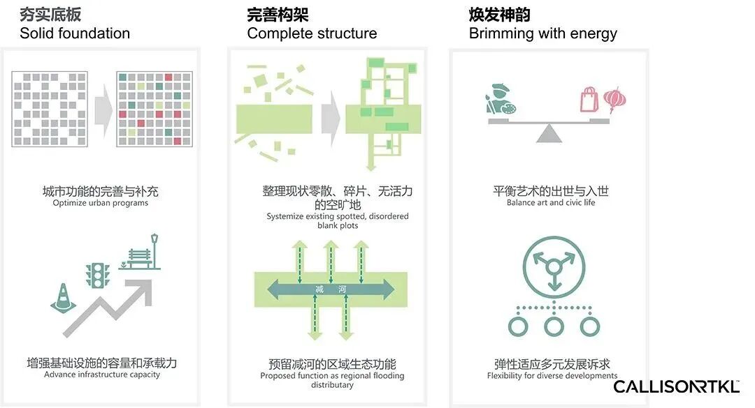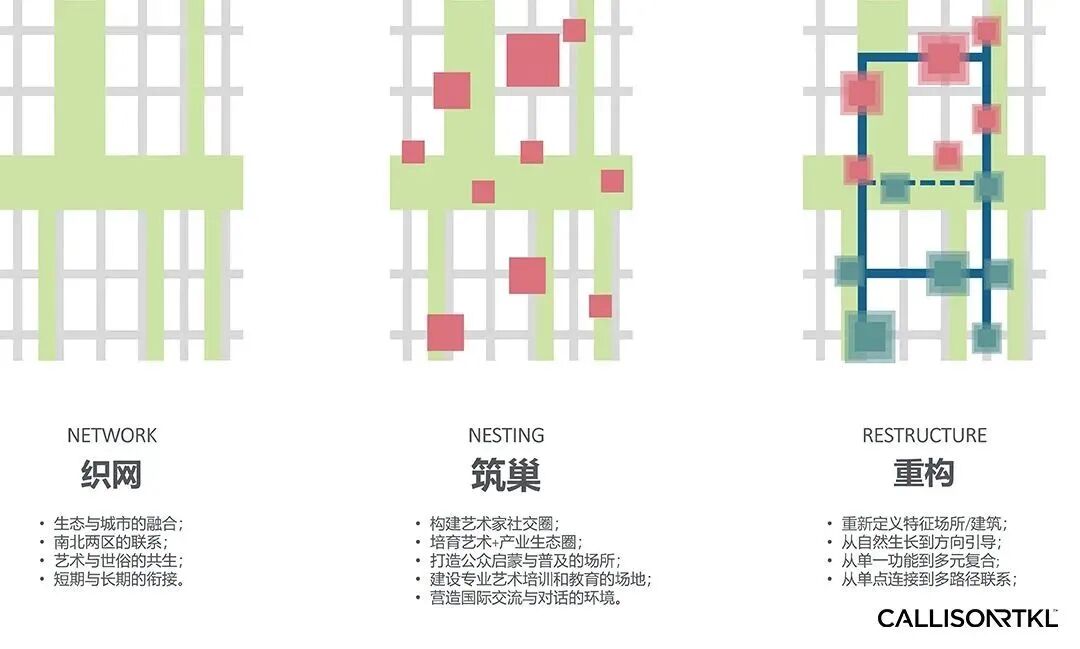 城市设计框架:一轴双翼三核心、两带多点带片区的发展结构和两横多纵的绿化网络,将艺术的出世与入世合为一体。