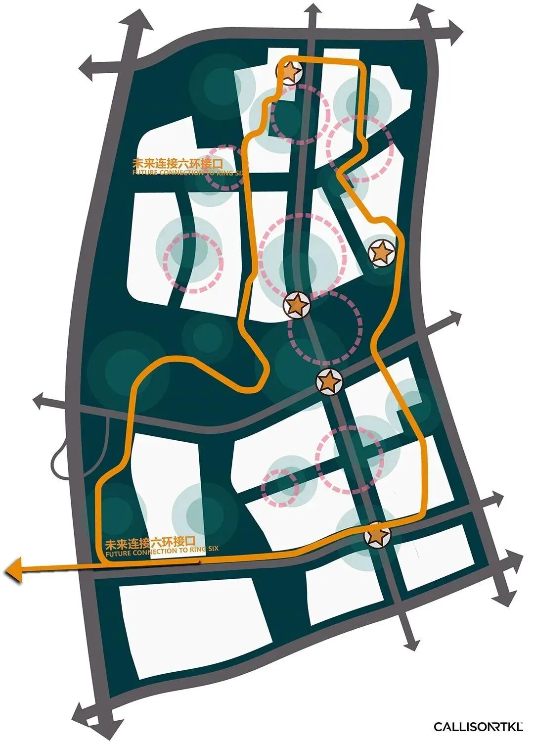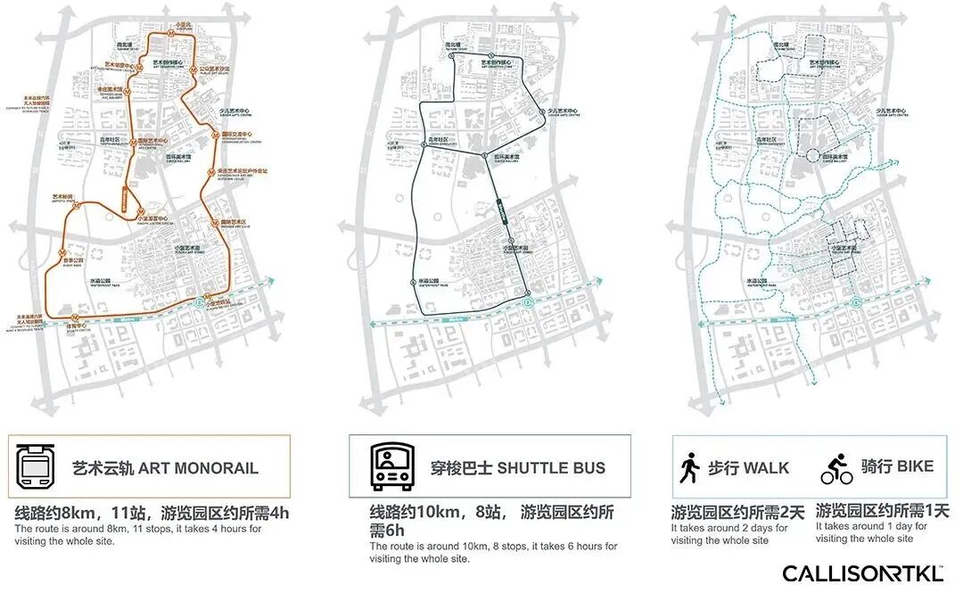 利用宋梁路减轻徐宋路的车流压力,顺接区域四界道路与区内路网,创造重要接口的门户形象。同时,以艺术云轨、穿梭巴士等公共交通串联区域各重要节点,形成完整的游览体系;徐宋路串联南中北三区,连接TOD和三个核心,并向外连接副中心和宋庄镇。