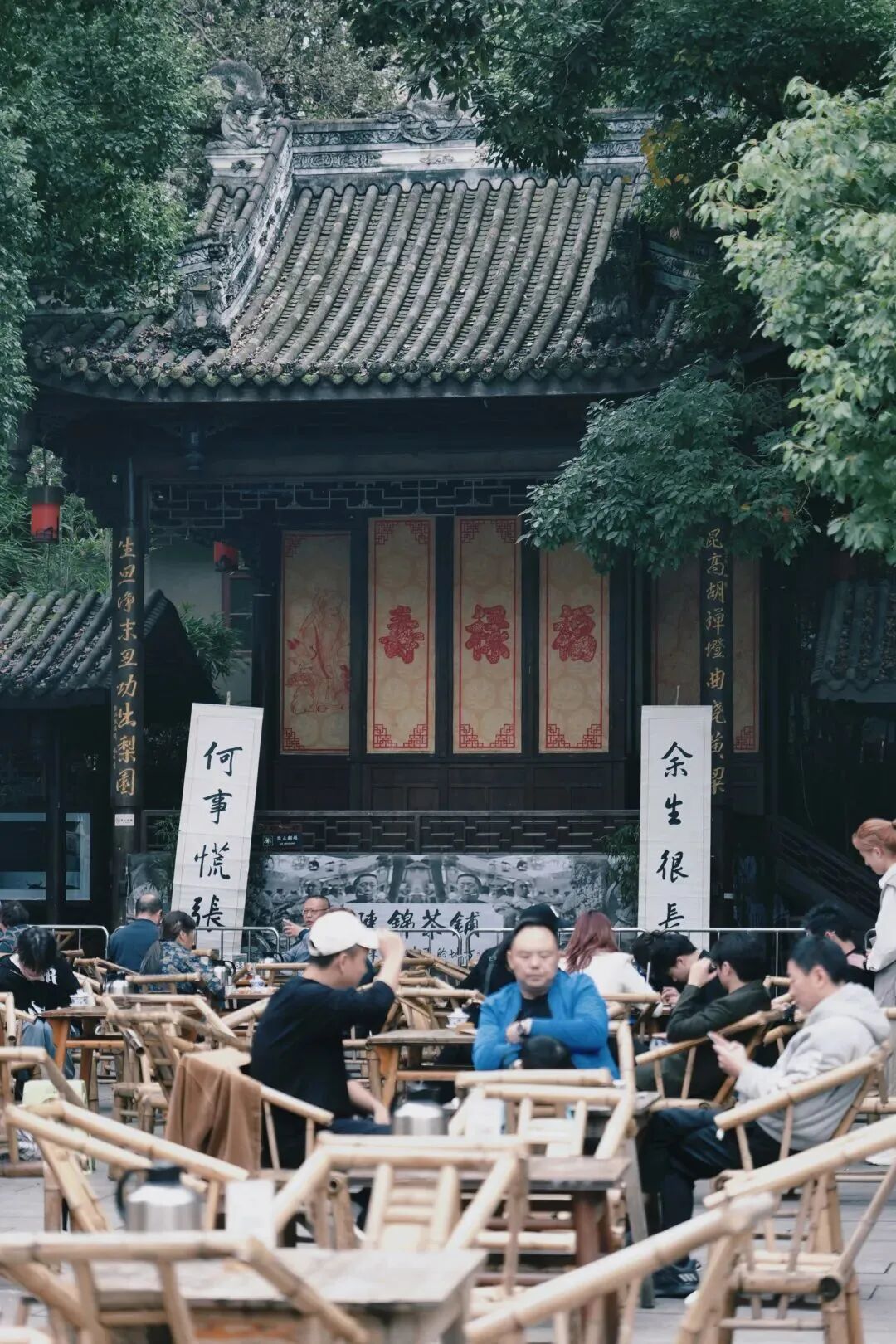 “余生很长,何事慌张”,这是立在陈锦茶铺露天茶座旁的一副对联。这个被称为成都最安逸的坝坝茶就藏在繁华高新区的铁像寺水街内。