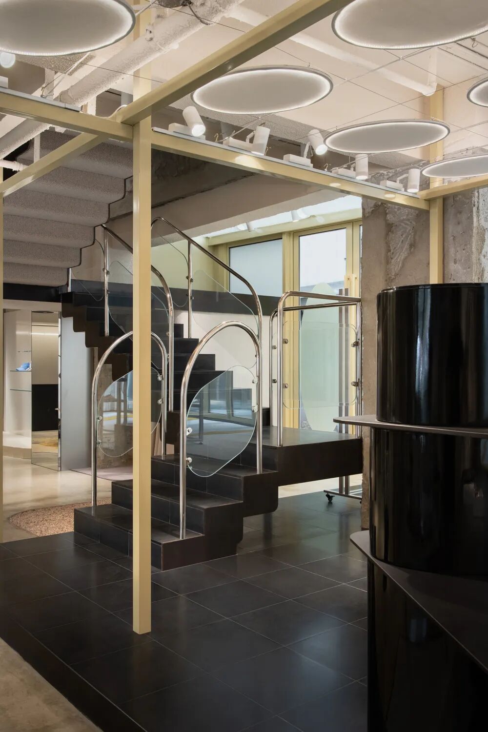 椭圆形波点的天花造型,既是装饰也是作为承载灯具的功能,黑色体块的雕塑道具丰富空间内的艺术装饰氛围,楼梯的设计与之呼应,更像是一个巨大的钢结构雕塑。楼梯结构由冷轧钢板整体焊接而成,结构本身作为装饰,柔化尖角,与贯穿空间的椭圆造型形成呼应,更有室内雕塑感。