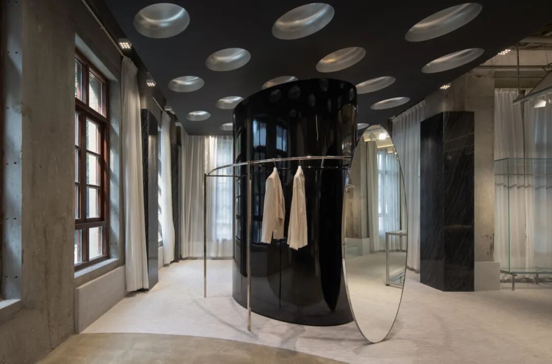 进入二楼是私宅内半开放的“客房空间”,这里相比一楼而言,私密感提升。Sò Studio使用大理石石材对部分墙面及柱体进行了包裹处理,让裸露的墙面和装饰墙面的比例达到一定均衡,而非一楼的全裸墙面处理。地面选用视觉柔和的编织地毯,更具有居家感。独立的黑色试衣间造型与阵列的椭圆造型吊顶相呼应,而三个小隔间的吊顶装置更像是日式屏风造型,用于界定小房间的区域。