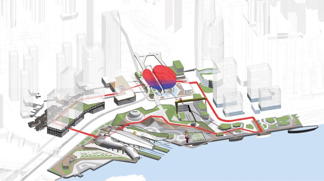 作为整个项目的公共交通枢纽,人们乘坐地铁到达后,可通过时空船场前往滨水空间、商业或办公楼等目的地。