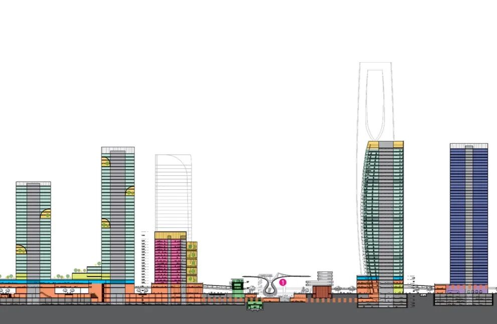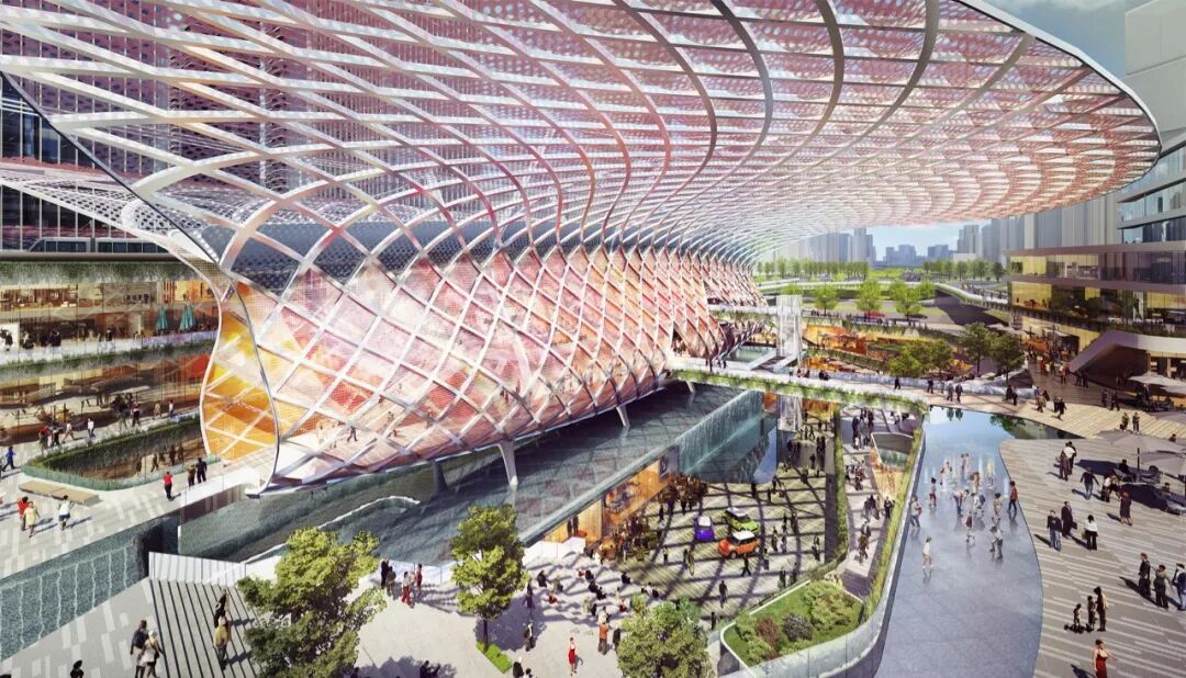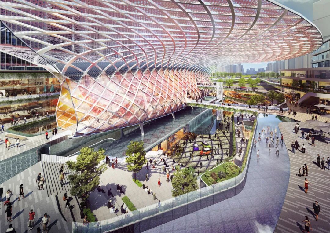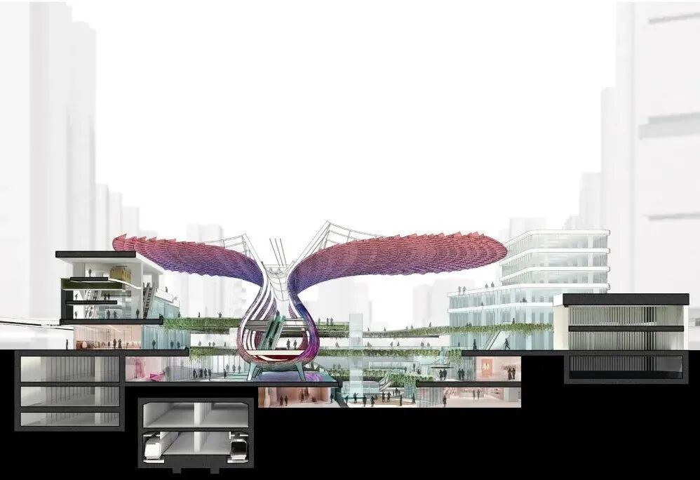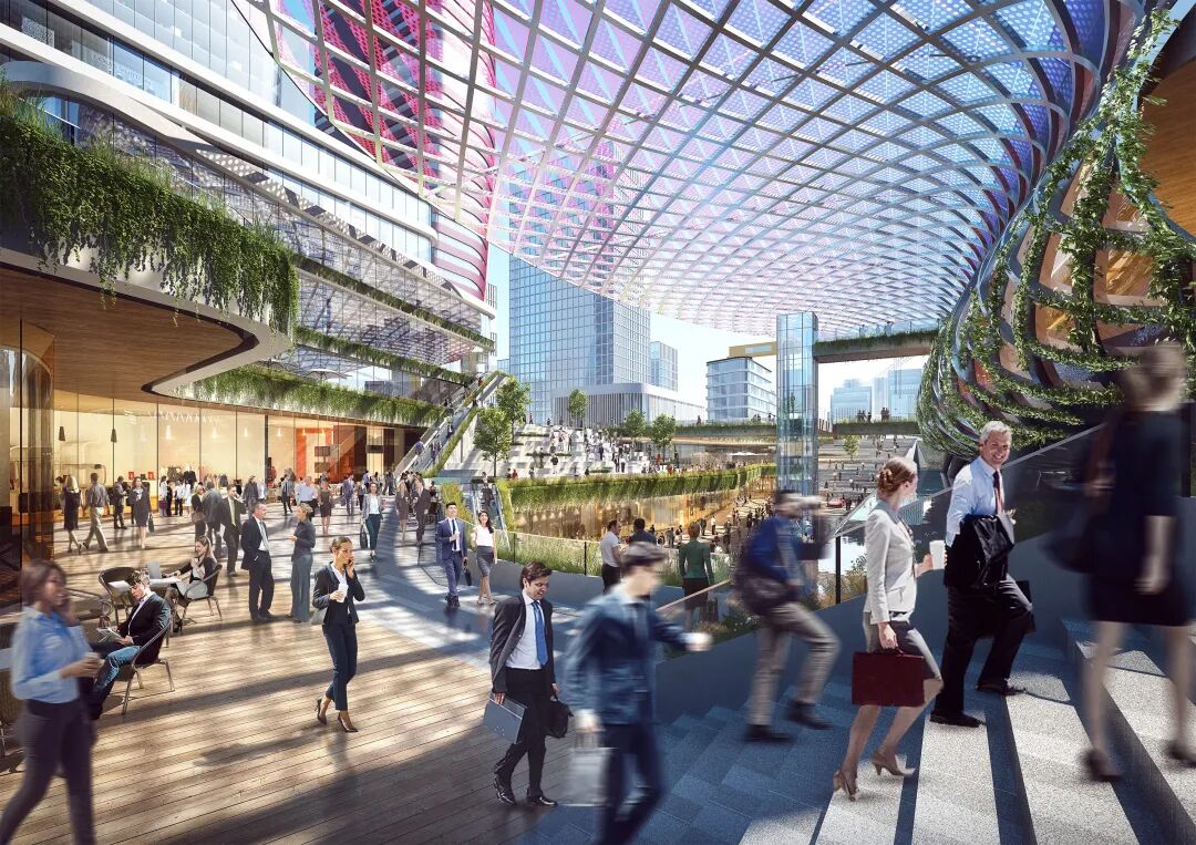 3条城市地铁线在这里交汇,也是两条城市绿轴的交界点,起到了项目“城市公共客厅”的功能。