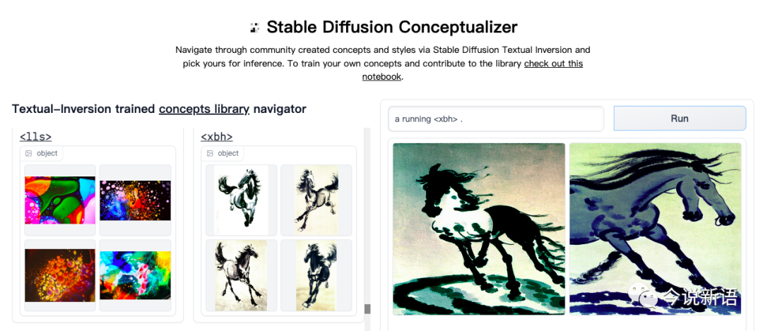 那如果其他用户想使用这个风格,或者想使用我前面训练的徐悲鸿画的马这个对象,该怎么办呢?现在这个项目的官方公布了一个用户共享库,所有用户愿意公开的训练结果都进入这个共享库,其他用户可以随意挑选训练完的概念进行绘画。