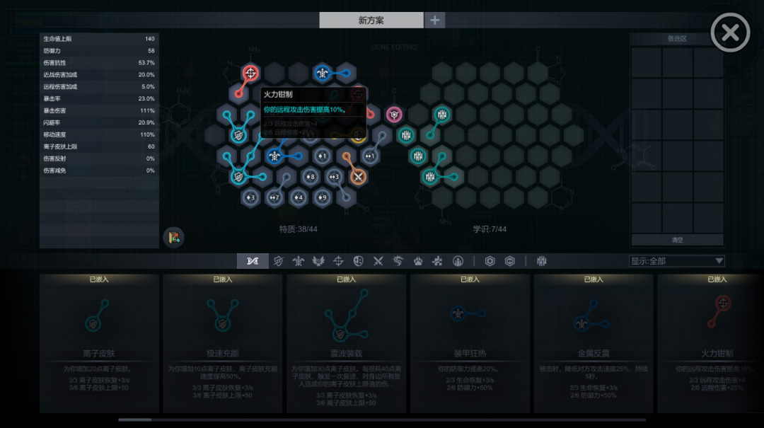 自然,《开普勒斯》不止于与凶险的环境搏斗。当玩家有余裕完成提示的任务时,这款游戏开始解锁出更多系统,露出它的另一面:除了砍树种地,角色还有着能提升基础能力的基因系统,能粗暴地提升攻击、防御,也有增加建设距离这样的功能性技能。而基因系统的解锁方式,近似收藏玩法,要玩家不断收集各种全新的材料。