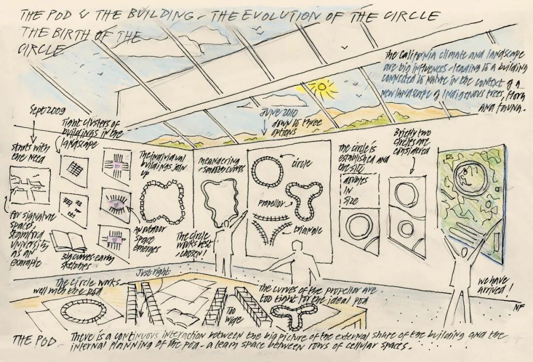 ✸ 乔布斯告诉他的传记作者沃尔特·艾萨克森,他希望创造一个精神代代相传的创造性园区。艾萨克森写道,乔布斯选择 Foster + Partners 参与该项目是因为乔布斯认为他们是世界上最优秀的建筑师。诺曼·福斯特描述了他与乔布斯之间一种亲力亲为且高度个人化的工作关系。