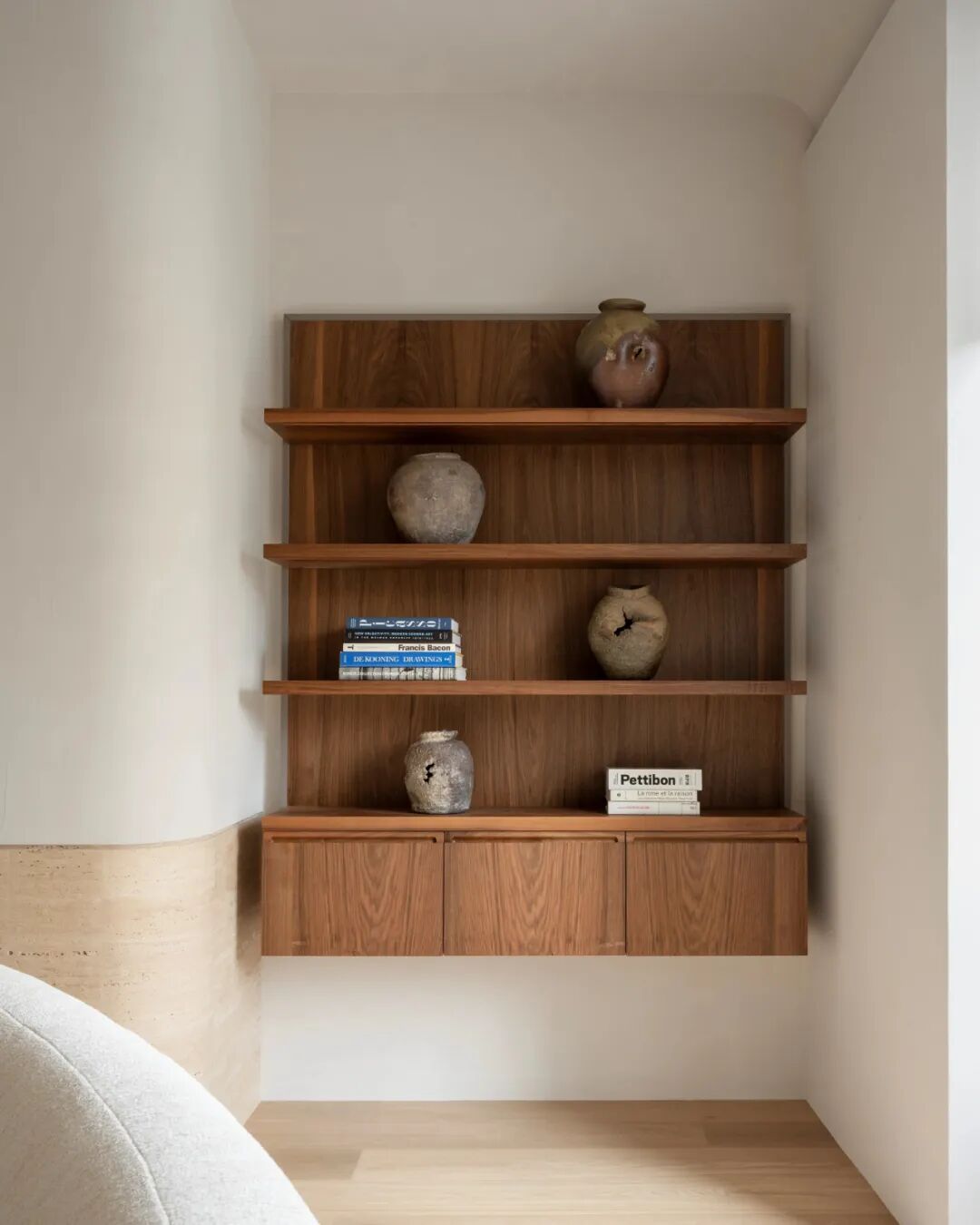 A restrained selection of finishes and a formal strategy making abundant use of curved shapes to avoid hard shadows all contribute in creating a peaceful space, where sound, light & vision all become part of a coherent whole.