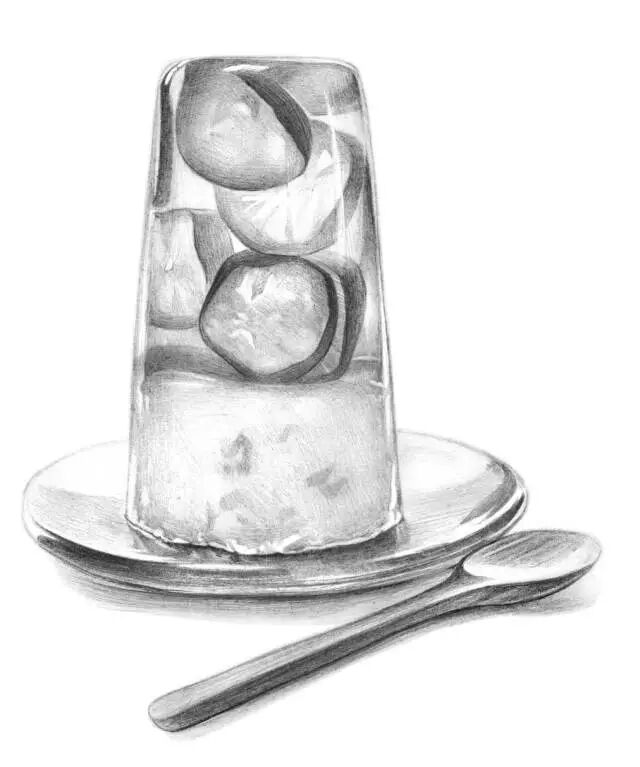 ▲本案例要注意整体色调较浅,用笔力度较轻,但要抓住重叠处、瓶底的折射影像等几个重色的点,将它们加深强调出来。