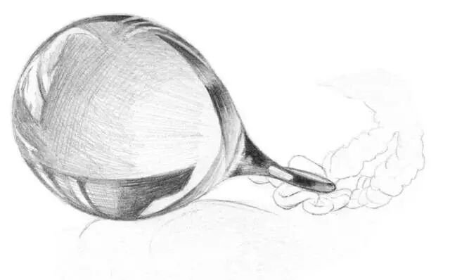 ⑦画出瓶口的深色轮廓,注意留白其中细小的高光。玻璃瓶上除了高光部分留白,其他地方均可画一层浅浅的排线。左侧边缘的排线最深,其中可以不时加一些小高光,以表现瓶子的晶莹感。加深水面轮廓,留白水面上的高光。