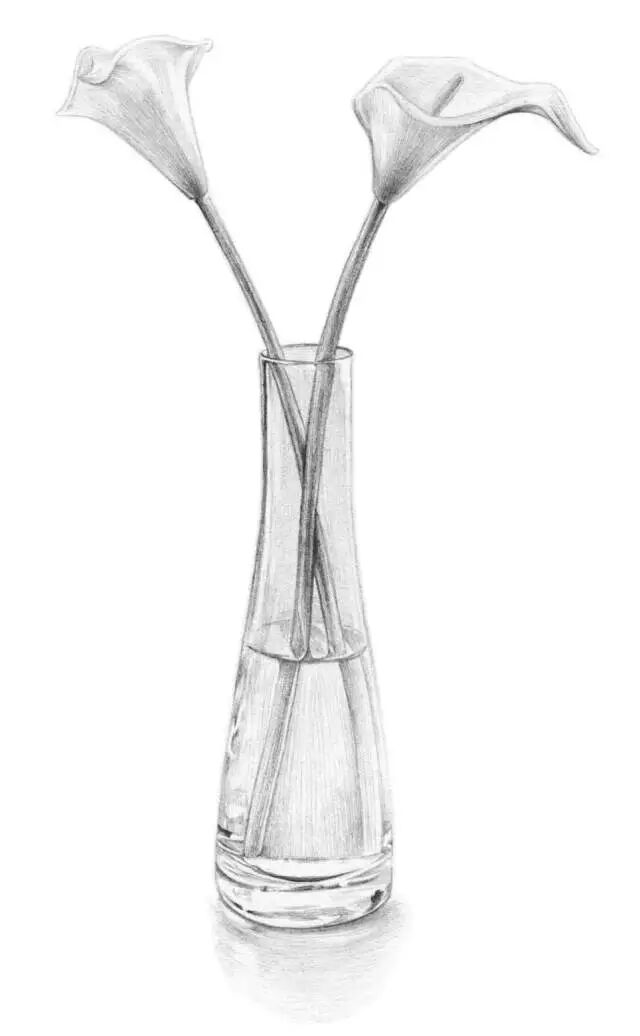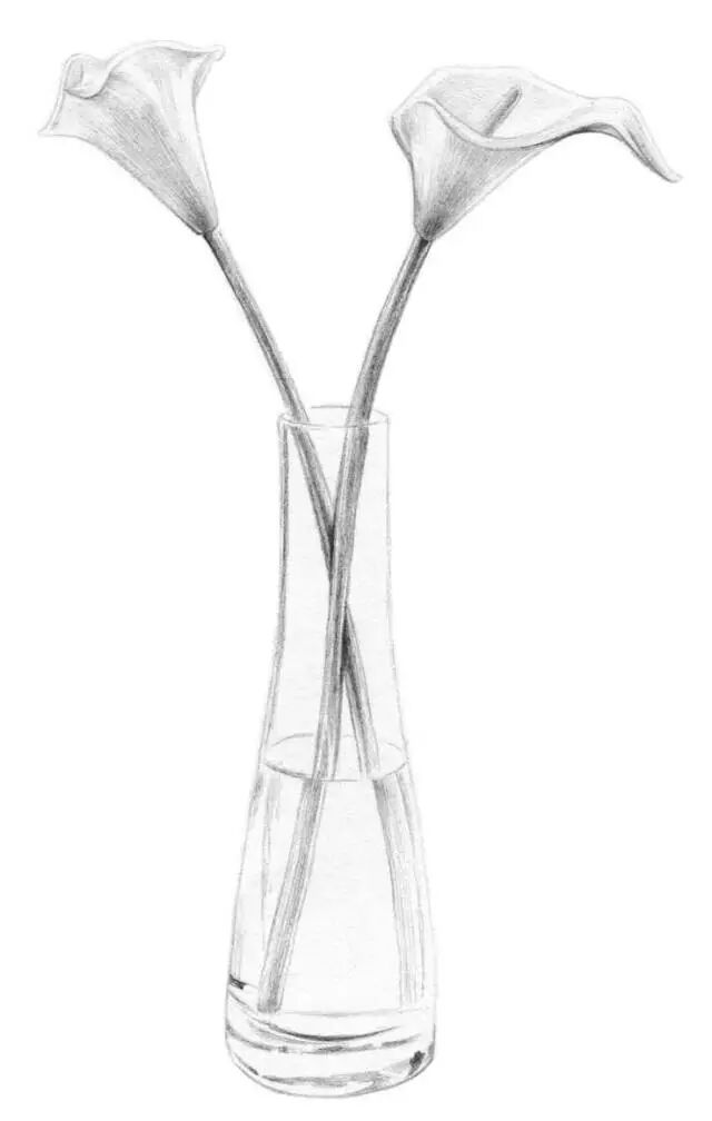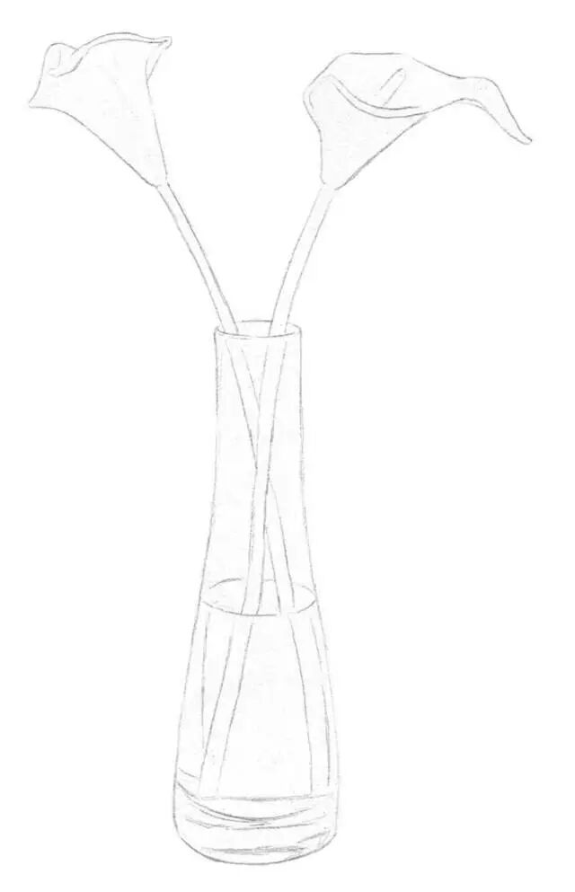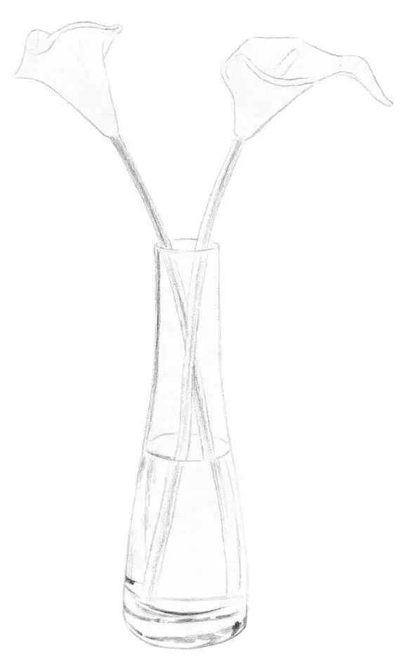 ③描出花瓣的厚度与花蕊的形状,并画出花茎,注意花茎插入水中的部分会产生折射的“断层”。擦去辅助线,用纤细的铅笔再描一下,得到完整的线