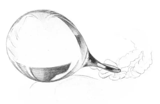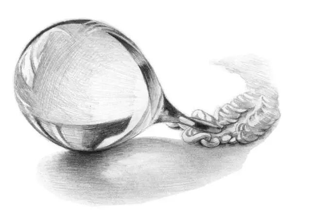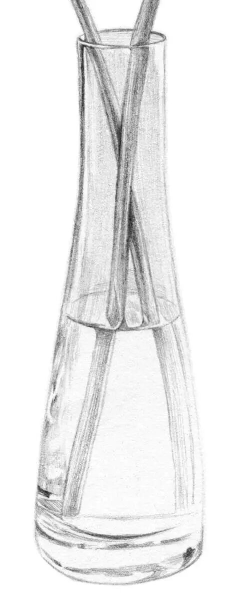 ⑧画出水中的调子,瓶底可以不画,以表现出厚厚的玻璃底的感觉。画出花瓶的影子,注意透明物体影子中的浅色光晕要表现出来。