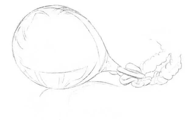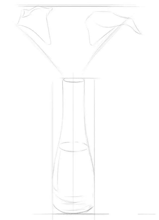 瓶子的框架用一个高挑的矩形来表现,而花朵部分的框架就像是一个倒三角。可以借助一条中心线来画出瓶子的形状,两边的曲线尽量对称。