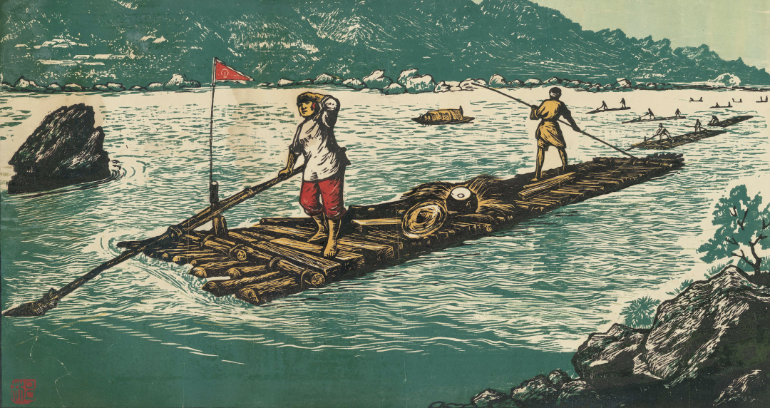 吕林,支援宝成铁路,套色木刻版画, 49×26.5cm ,1954