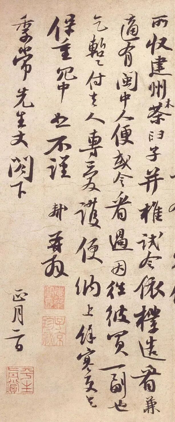 轼启:新岁未获展庆,祝颂无穷,稍晴起居何如?数日起造必有涯,何日果可入城。昨日得公择书,过上元乃行,计月末间到此,公亦以此时来,如何?窃计上元起造,尚未毕工。轼亦自不出,无缘奉陪夜游也。沙枋画笼,旦夕附陈隆船去次,今先附扶劣膏去。此中有一铸铜匠,欲借所收建州木(此字旁注)茶臼子并椎,试令依样造看兼适有闽中人便。或令看过,因往彼买一副也。乞蹔付去人,专爱护便纳上。余寒更乞保重,冗中恕不谨,轼再拜。季常先生文阁下。正月二日。