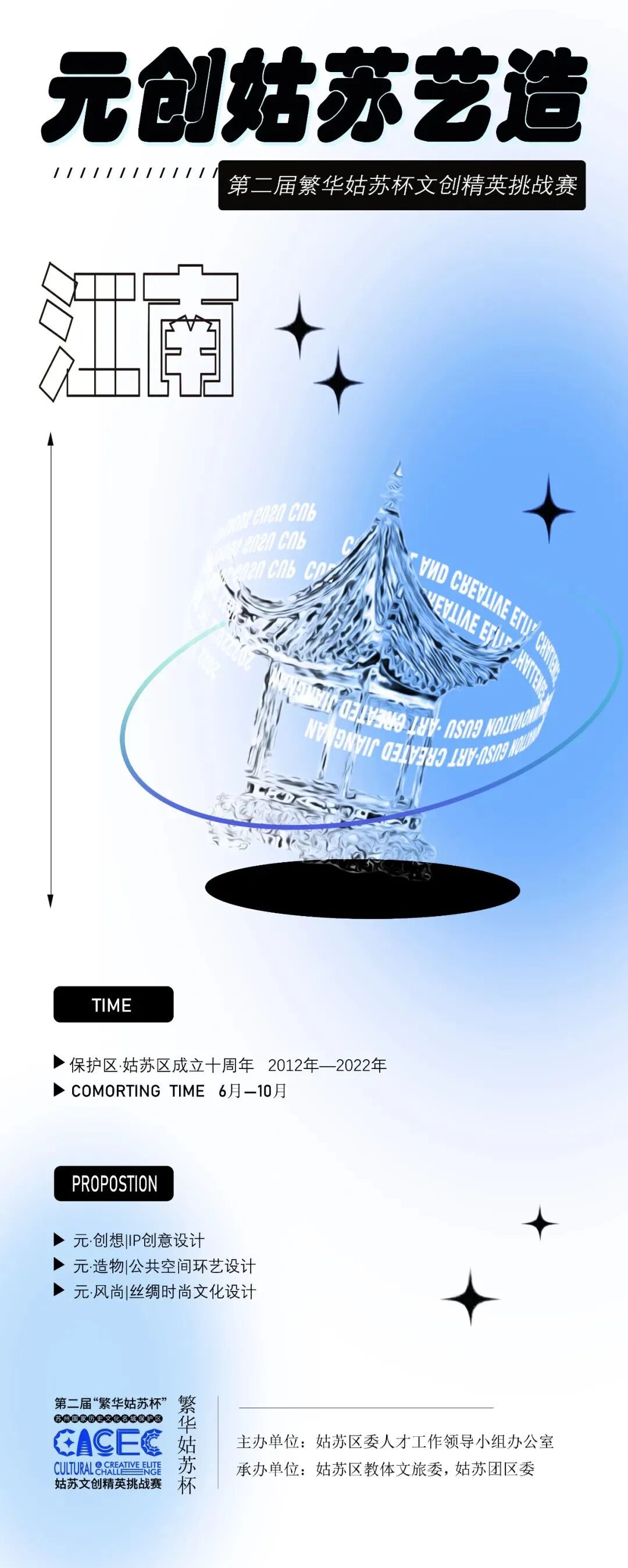 第二届“繁华姑苏杯”文创精英挑战赛以“元创姑苏,艺造江南”为主题,通过IP创意设计、公共空间景观艺术设计、丝绸文化创意设计3个赛道,面向国内外高校、专业设计机构、个人设计师征集创意,让姑苏文化元素更具创造性、创新性。