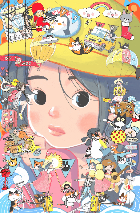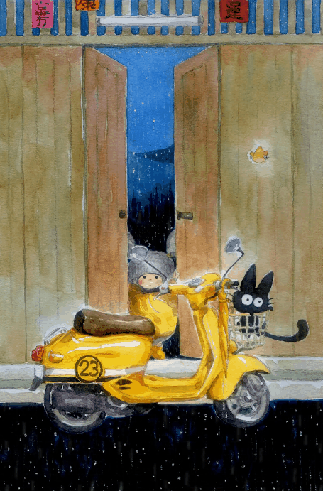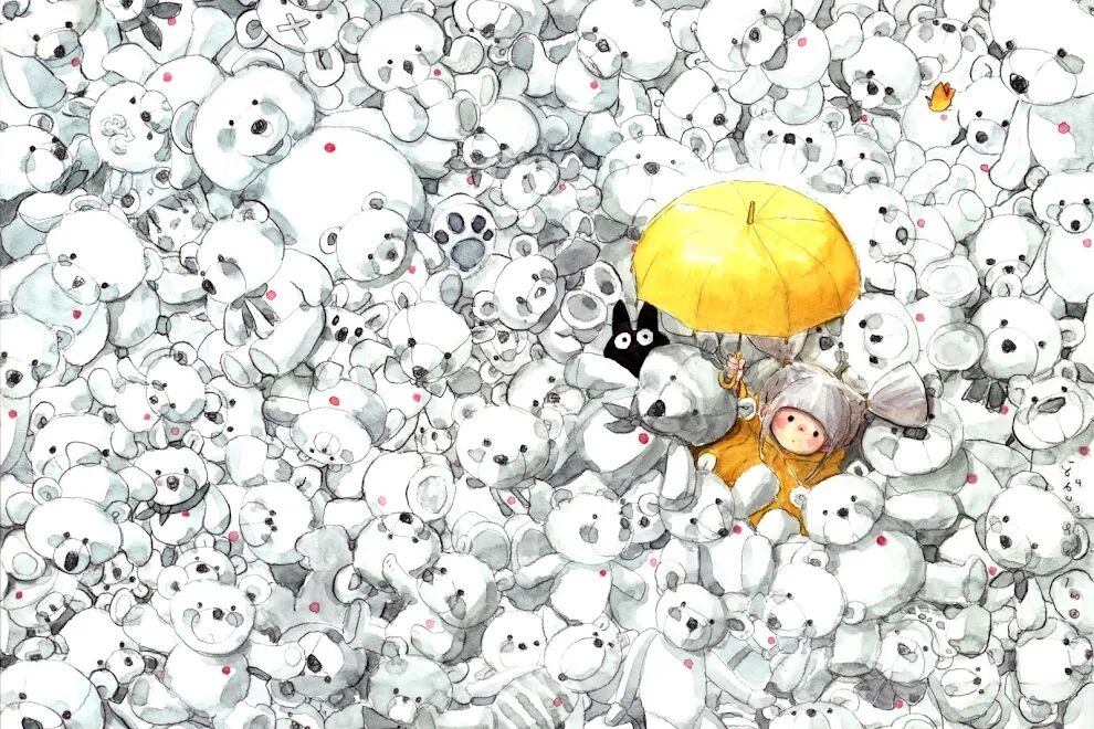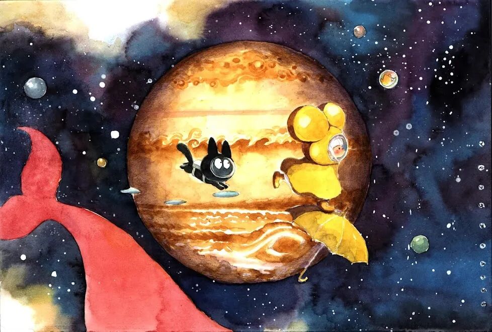 结合星球、雨天、玩偶等众多童话里的构成元素再加上色彩鲜明的搭配和背景色的奇幻对比,让第一眼看到画面的观众很难不去产生宫崎骏画风的影子,再加上水彩的肌理纹路导致画面的手绘感整体提升了一个台阶,非常适合定格动漫的表现形式。