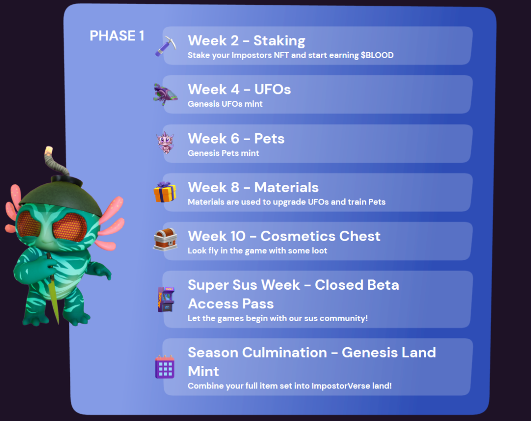 Impostors 也为购买 NFT 的玩家提供了整个赛季的每周活动,从游戏玩法到 UFO、宠物等道具获取因有尽有,基本上买了 NFT 后在游戏中获得了相应价值甚至超过本身定价的奖励。