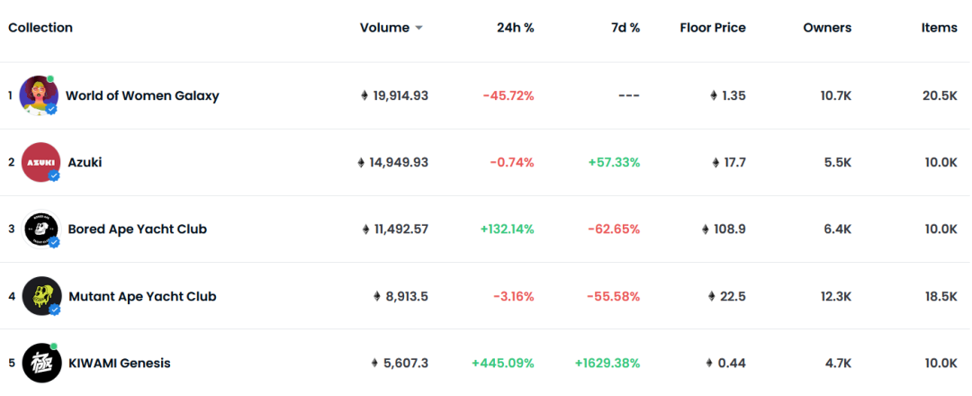 这周的 Opensea 排行榜还是有很大变化的,首先前五并不是我们熟悉的 Yuga Labs 大礼包,上周我们提到的 World of Women Galaxy 和 Azuki 均已第一第二的优秀成绩占领了榜单,所以我之前也说过真正有内容以及自我态度的品牌总会得到人们的认可,是金子总会发光!