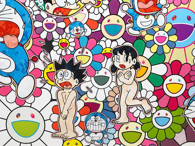 其实 Murakami.Flowers 是村上隆在 2000 年提出的超扁平系统的基础上被创造出来的。“超扁平”是指日本在太平洋战争中惨败 77 年后产生的文化概念,这个概念与流行音乐恰巧相反。日本在战后文化中无法建立由胜利者定义社会正义的结构,而是建立了反金字塔的等级制度,所以日本的漫画、动漫以及轻小说的叙事形成根源在于这种看似消极的感觉,但却永远无法完全支持获胜者一方。