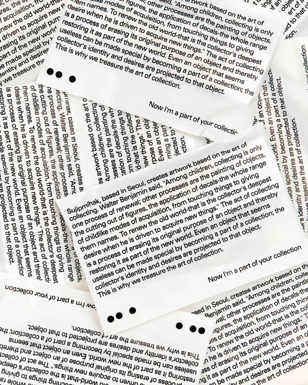 Sujipmihak是一家位于首尔的以收藏艺术为基础的品牌。韩国设计师Eunsun Park为 Sujipmihak 提供了全新的视觉方案。以收藏为主旨,强调购买艺术品的体验,用简约的字体和平实的语言令消费者体会。同时可以更突出艺术品本身,也有着现代感的时尚。