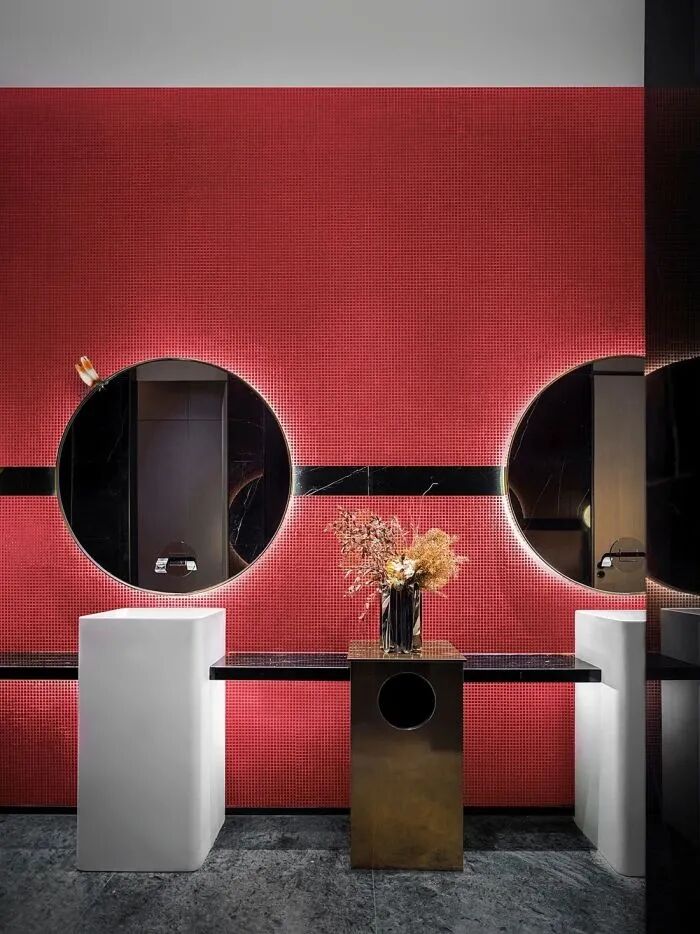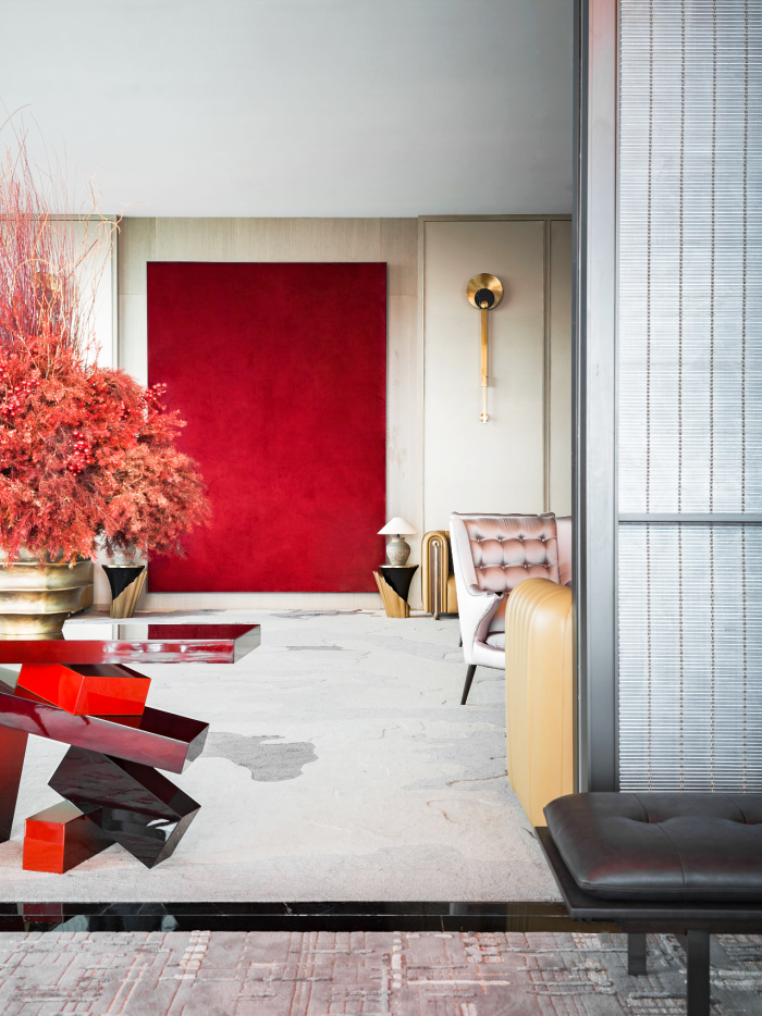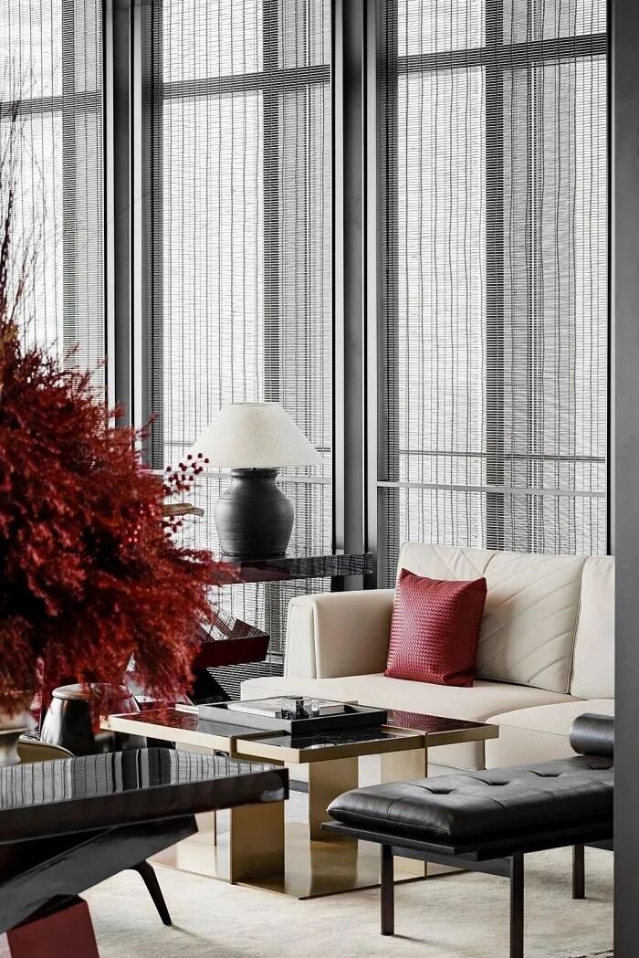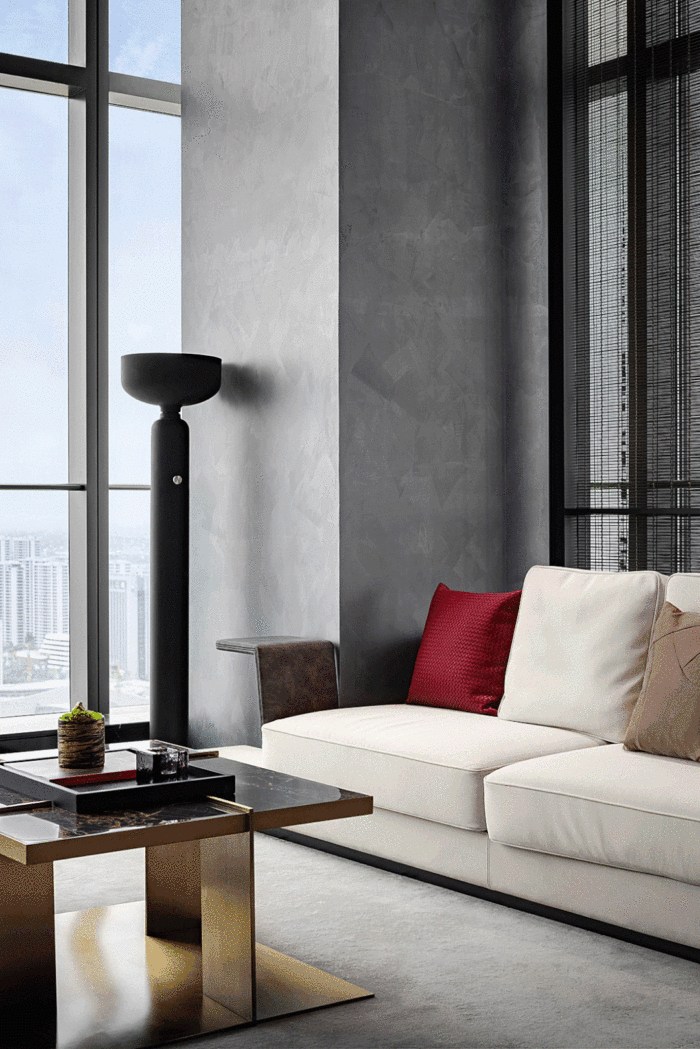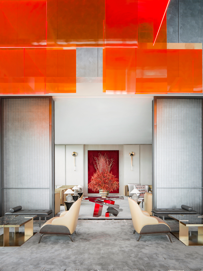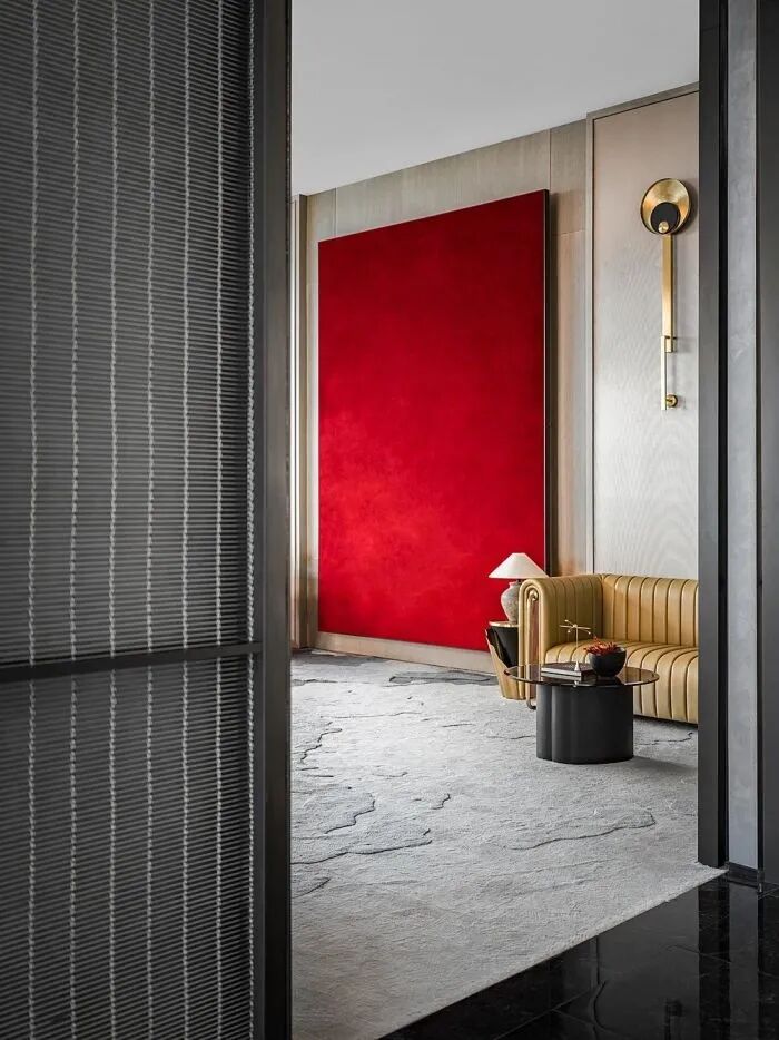 空间仍以灰色块面为底,用皮革柔化各处棱角,介入黑色石料与金属材质,点缀小面积的国粹红,将低调的雅致融汇于每一处设计语言中。