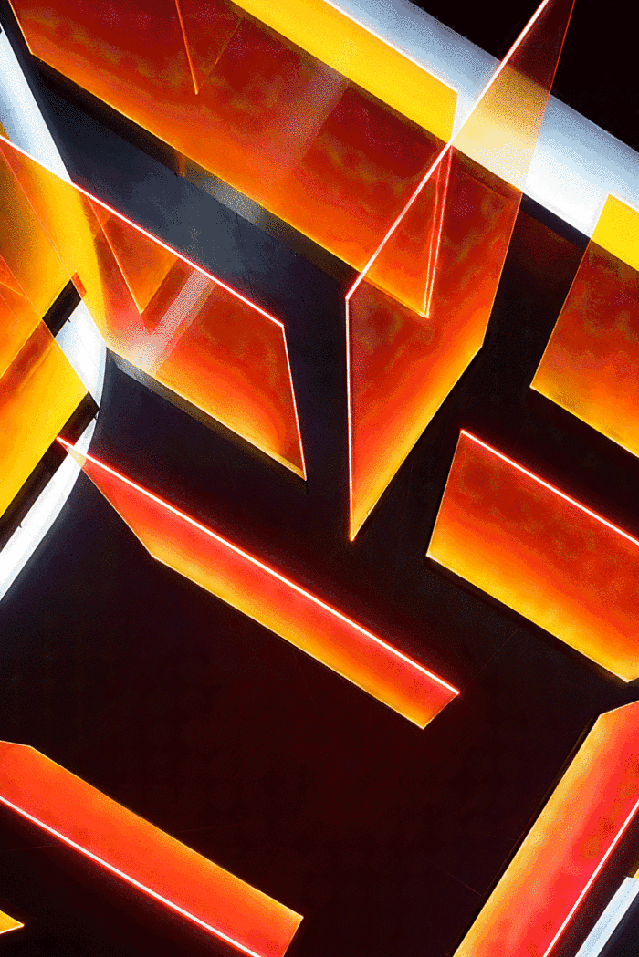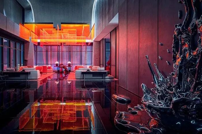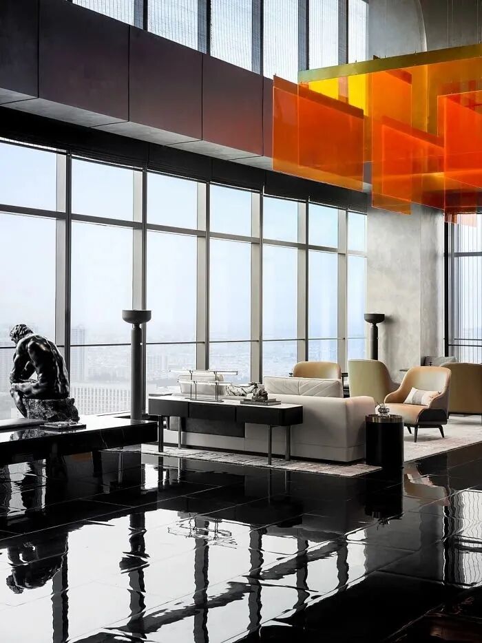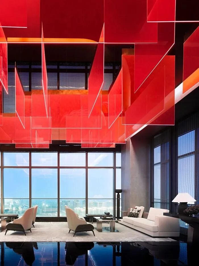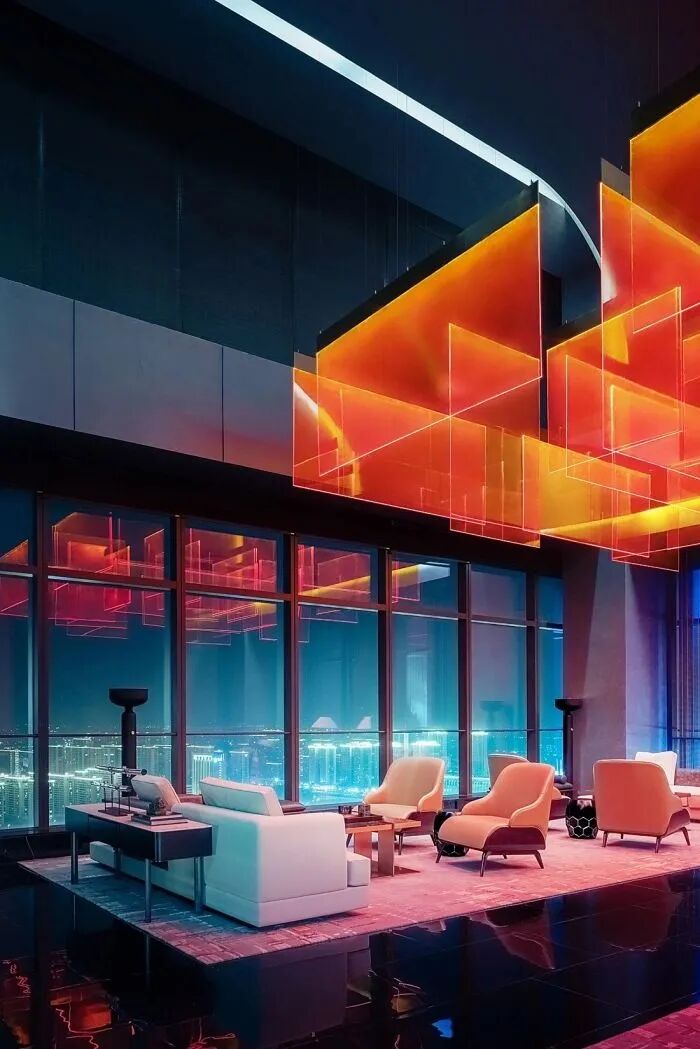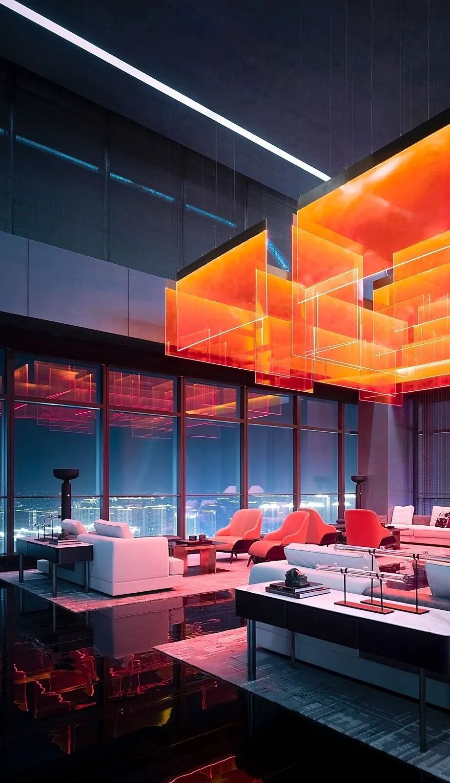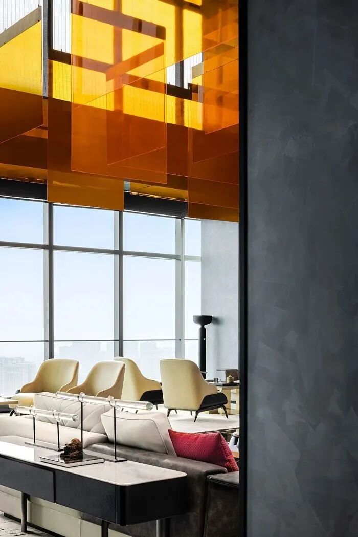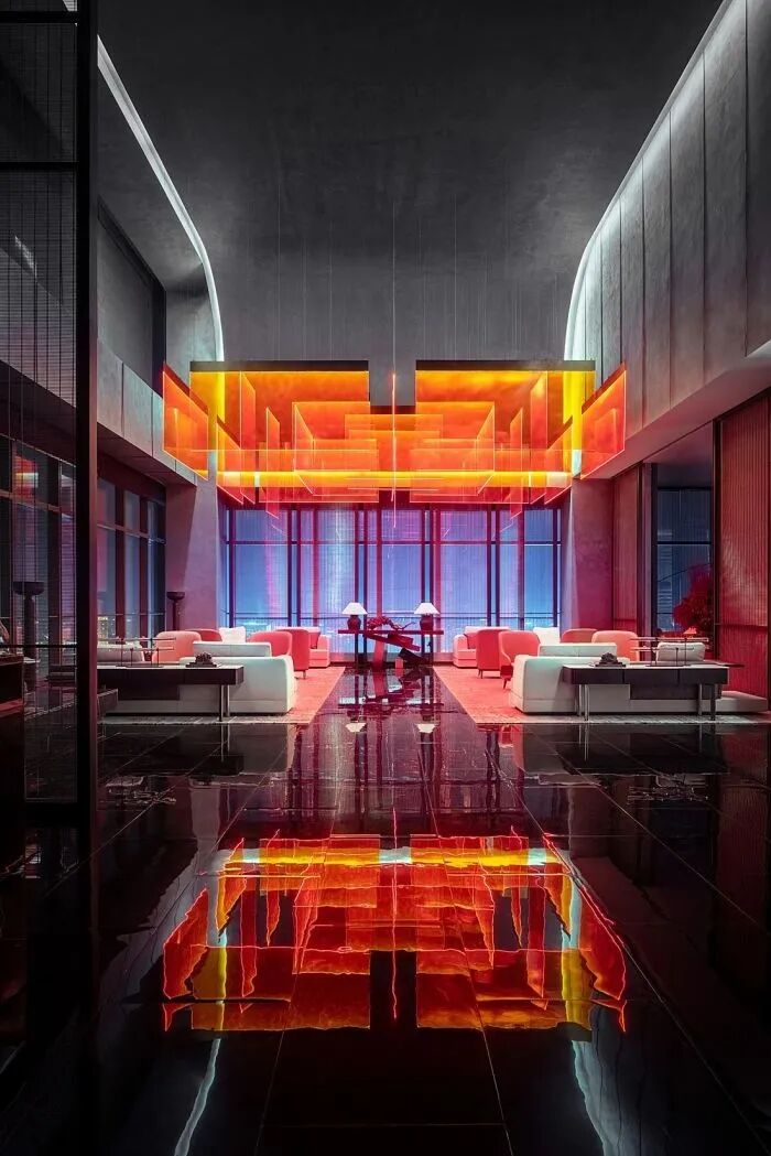 空中悬落的艺术装置灯组成为洽谈区的视觉中心,浓烈而炙热的橙红色,势要将白昼里最珍贵的阳光留住,却未曾想竟和黑夜碰撞出了些许赛博氛围。