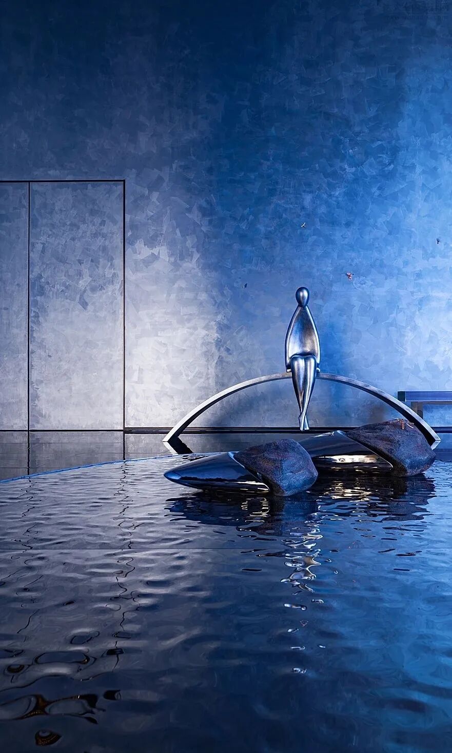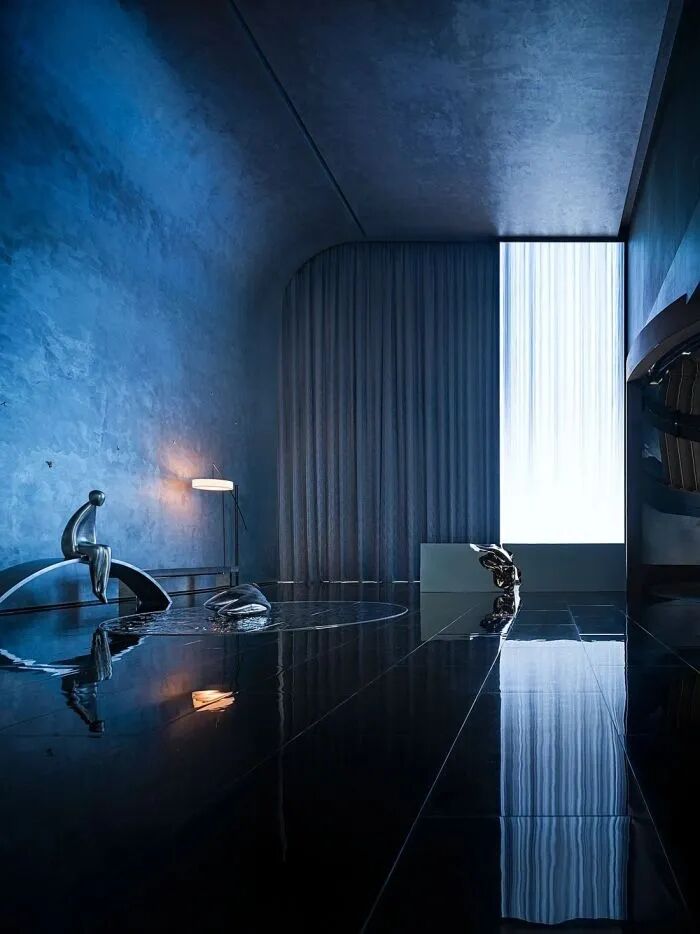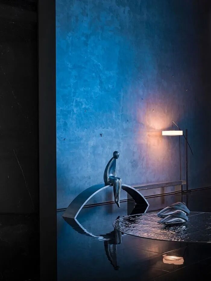 设计师在先锋的艺术氛围里加入新中式的家具映衬,将平湖的古典埋在每一道曲线和丝丝入扣的肌理之中,新旧交融,文化在无声处得以传承。