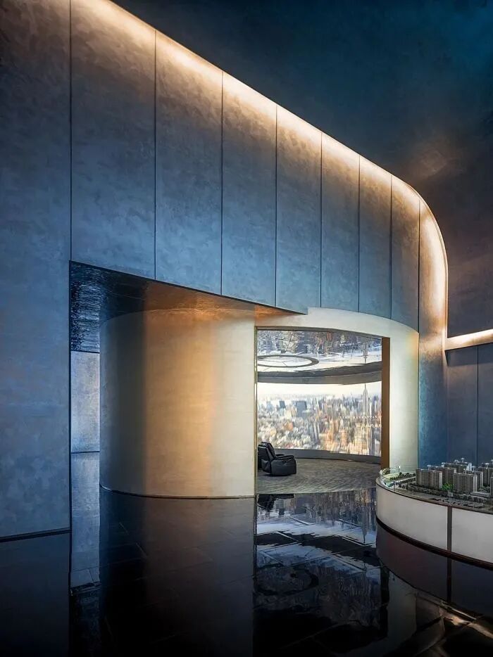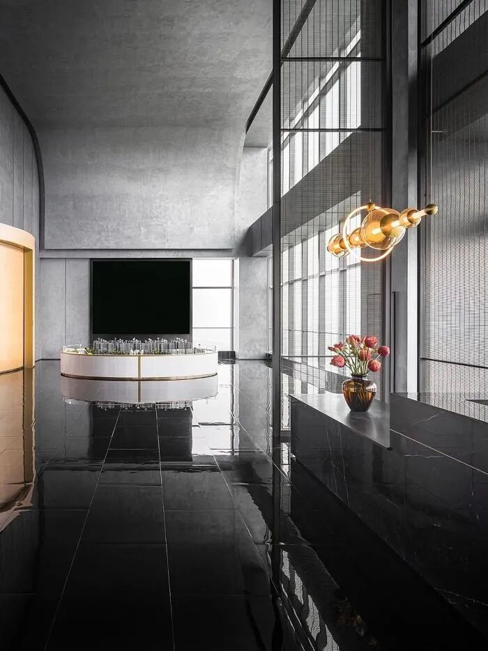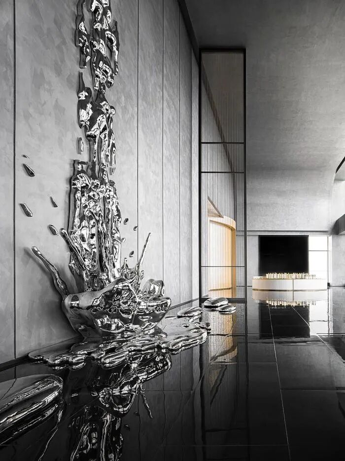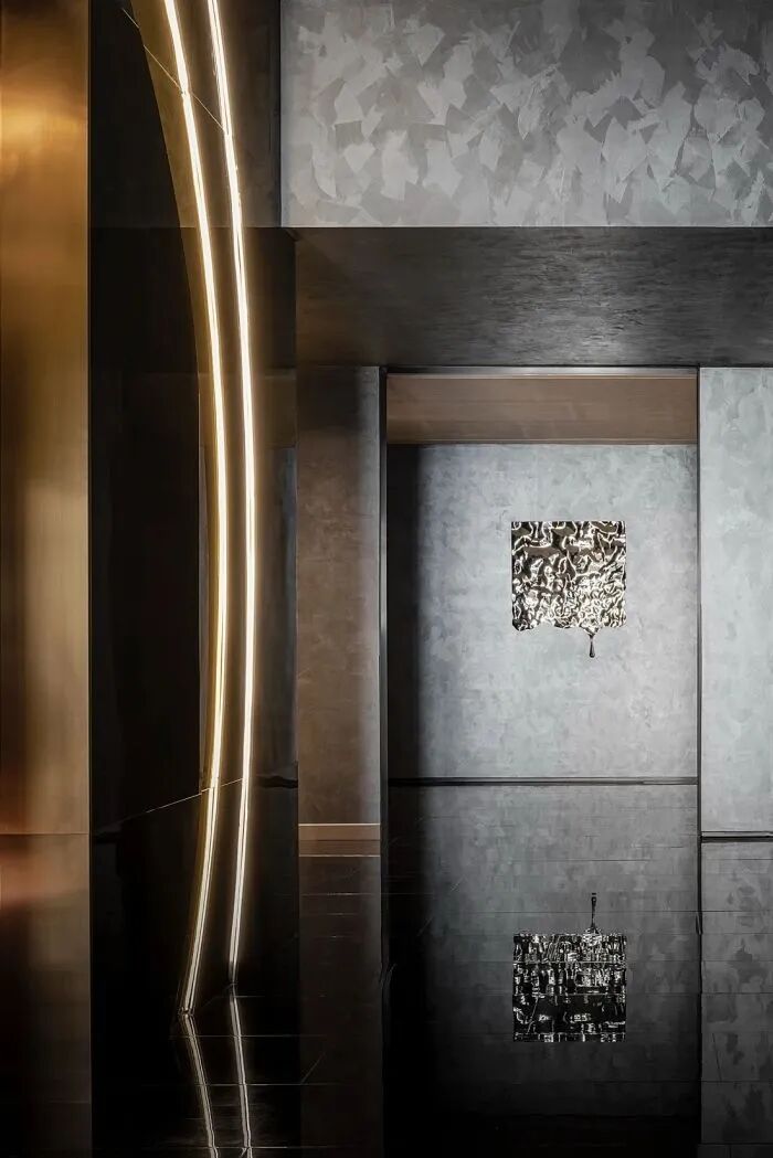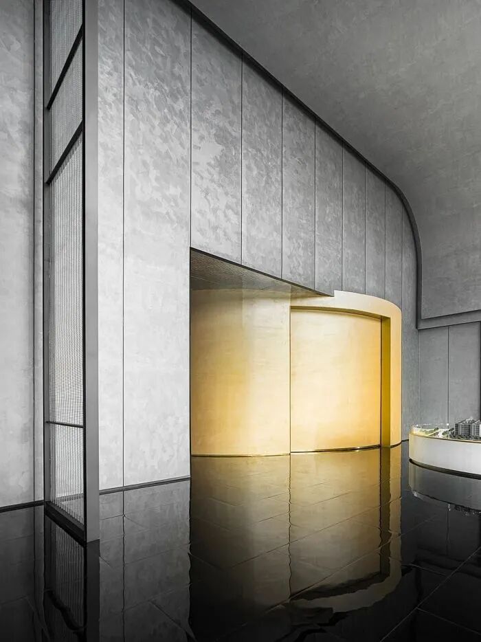 设计取其“金”字,时刻以金属勾勒,在接待处,一副生动的夜观小桥流水之境,拆解蕴意,再造金平湖。